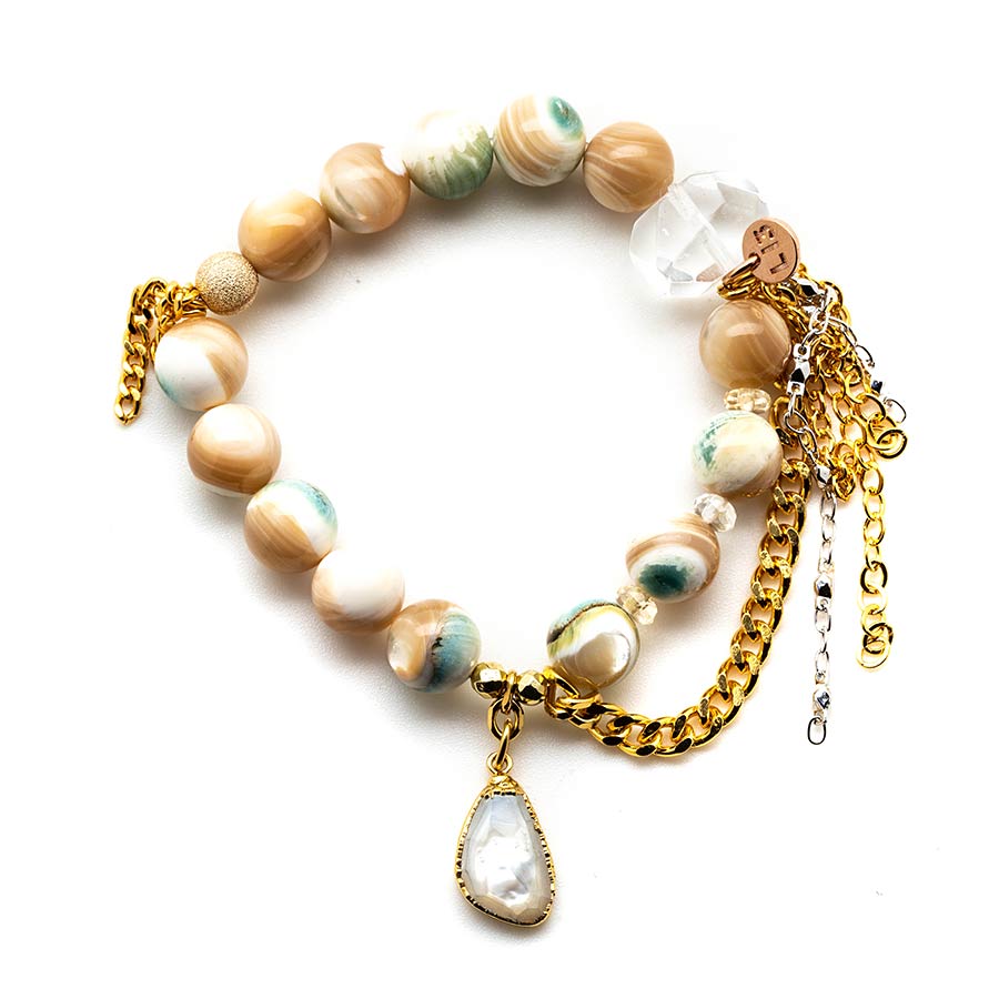 Abalone with a sterling silver wrapped abalone pendant. Sterling silver stardust accent bead and silver rhodium chain and tasseling. Quartz crystal accents. 7 inch stretch bracelet.