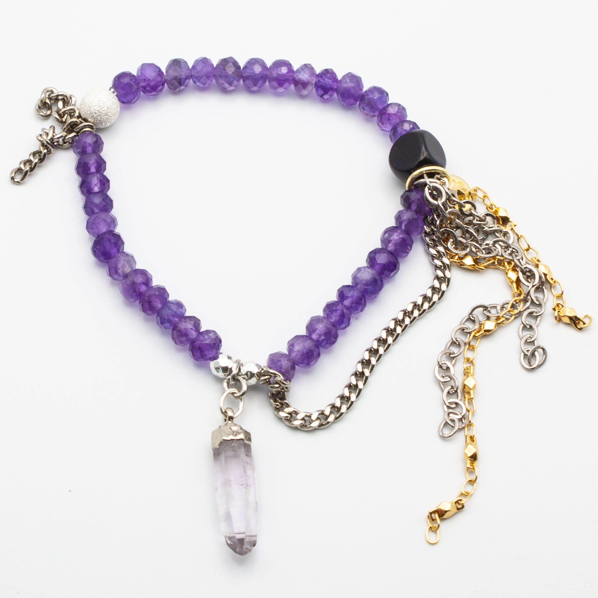 Petite rhondell amethyst with an sterling silver wrapped amethyst point pendant. Sterling silver stardust accent bead and gold rhodium chain and tasseling. 6mm rhondell. 7 inch stretch bracelet.