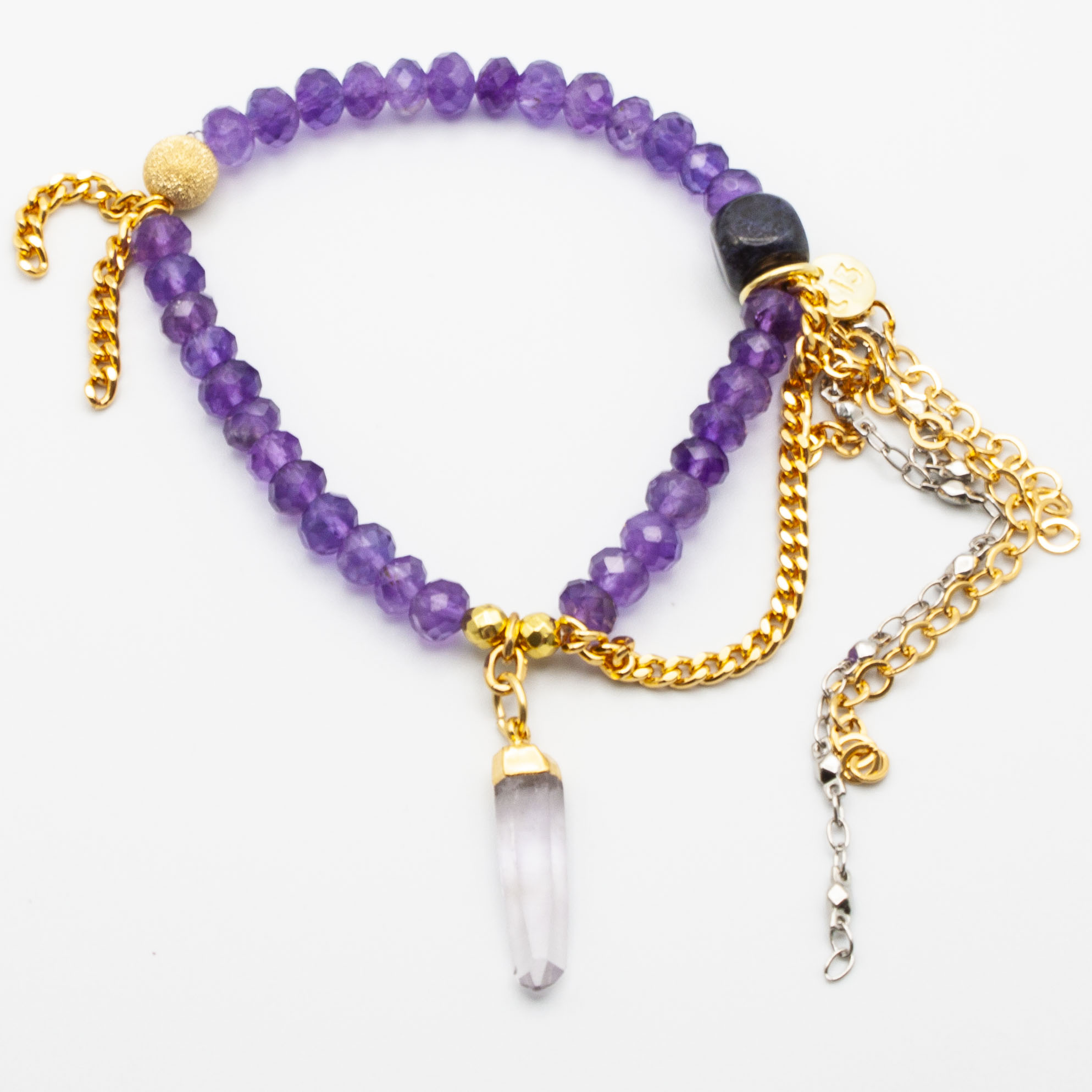 Petite rhondell amethyst with an 18kt gold plate wrapped amethyst point pendant. 18kt gold stardust accent bead and gold rhodium chain and tasseling. 6mm rhondell. 7 inch stretch bracelet.