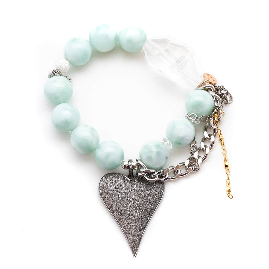 Large angelite with a diamond heart pendant. Sterling silver stardust accent bead and silver rhodium chain and tasseling. Quartz crystal accents. 7″ stretch bracelet.