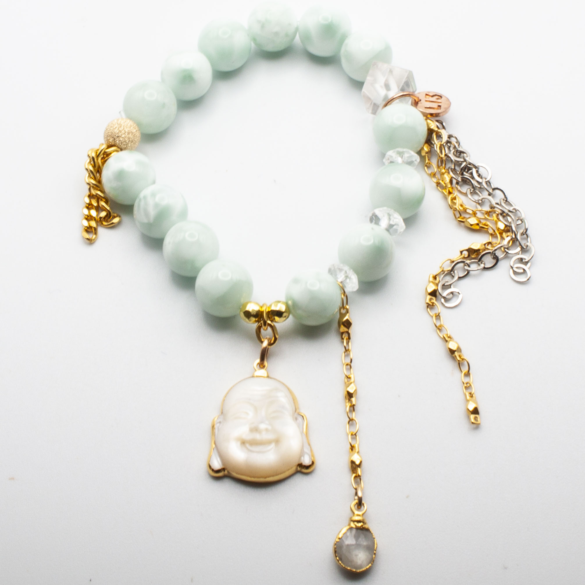 Angelite with a 18kt gold plate wrapped abalone prosperity buddha. 18kt gold stardust accent bead and gold rhodium tasseling. 10mm 7″ stretch bracelet.