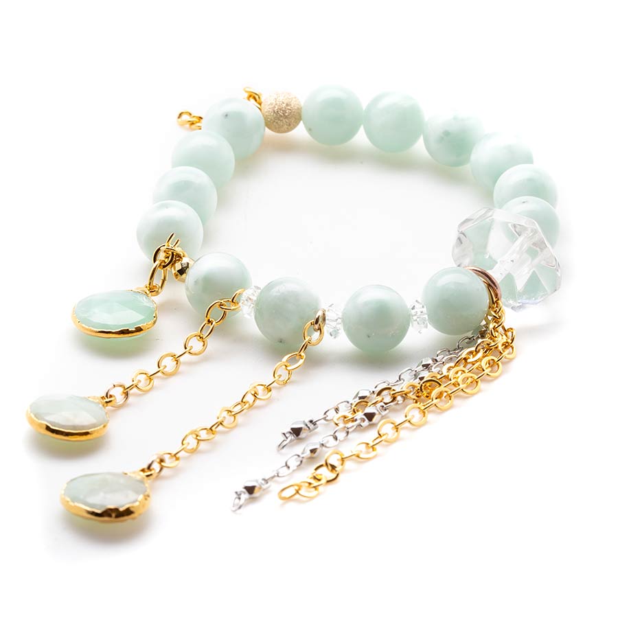 Angelite with 18kt gold plate wrapped amazonite pendants. 18kt gold stardust accent bead and gold rhodium tasseling. Quartz crystal accents. 10mm bead. 7″ stretch bracelet.