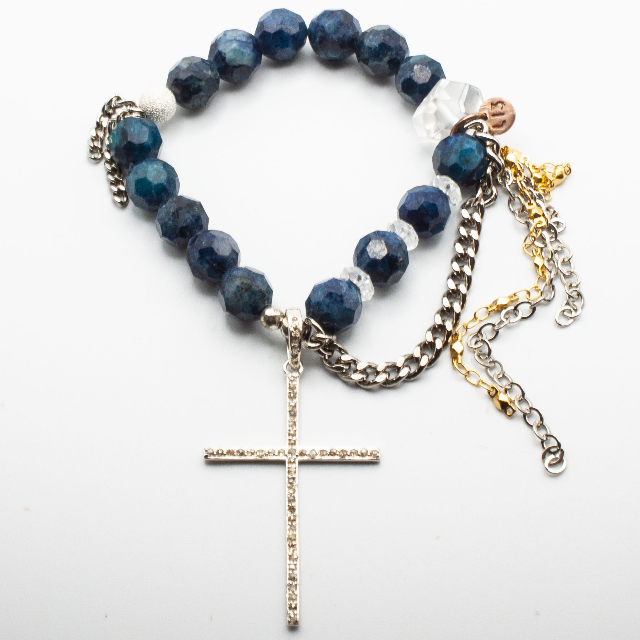 Apatite with a diamond cross pendant. Sterling silver stardust accent bead and silver rhodium chain and tasseling. 10mm 7″ stretch bracelet.