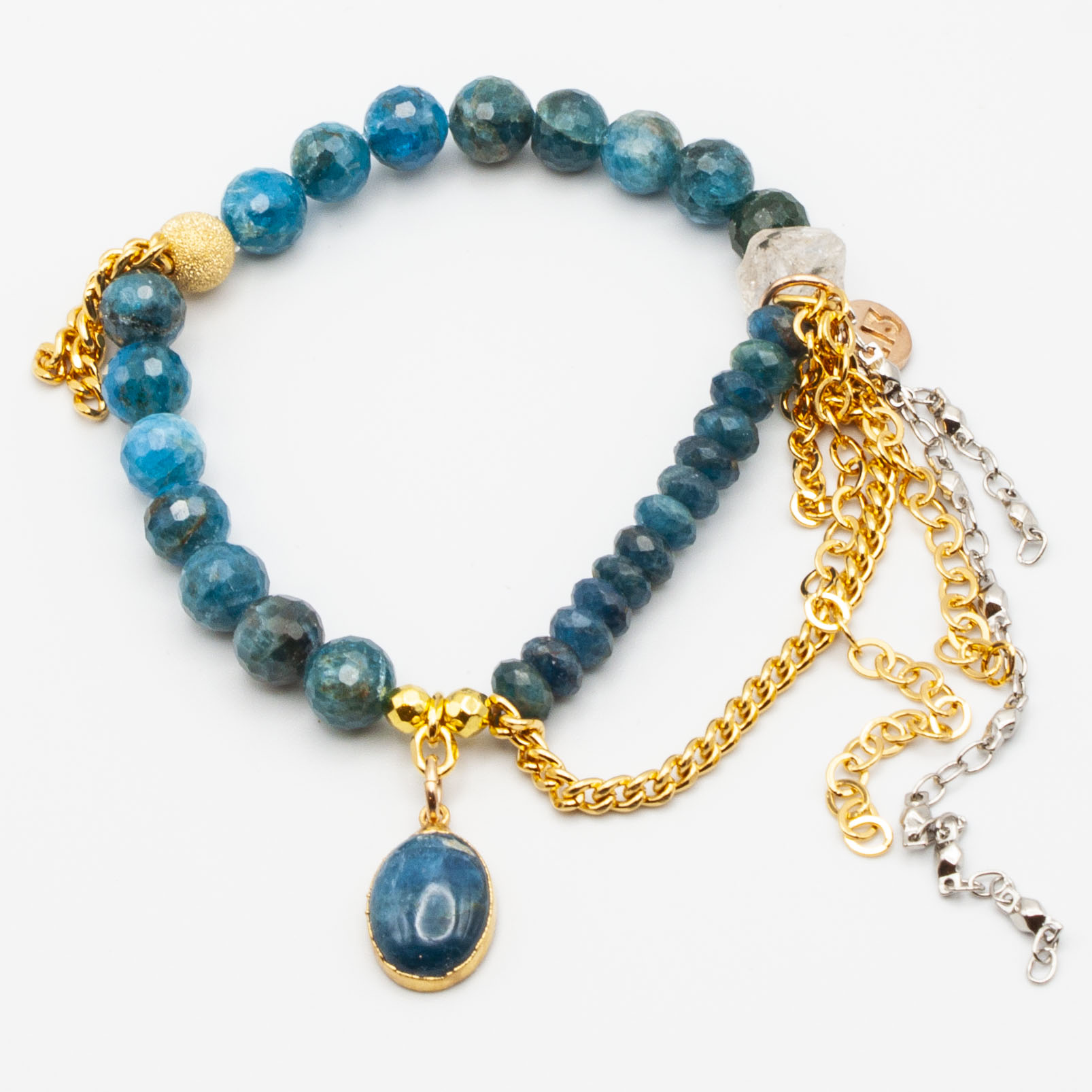 Apatite with a 18kt gold plate wrapped apatite pendant. 18kt gold stardust accent bead and gold rhodium chain and tasseling. 8mm bead. 7 inch stretch bracelet.