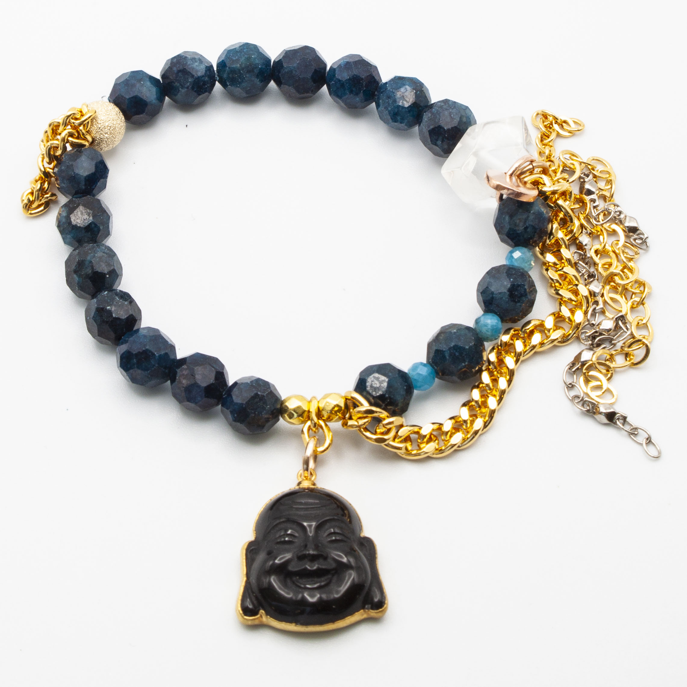 Faceted apatite with a 18kt gold plate wrapped obsidian buddha pendant. 18kt gold stardust accent bead and gold rhodium chain and tasseling. 8mm. 7″ stretch bracelet.