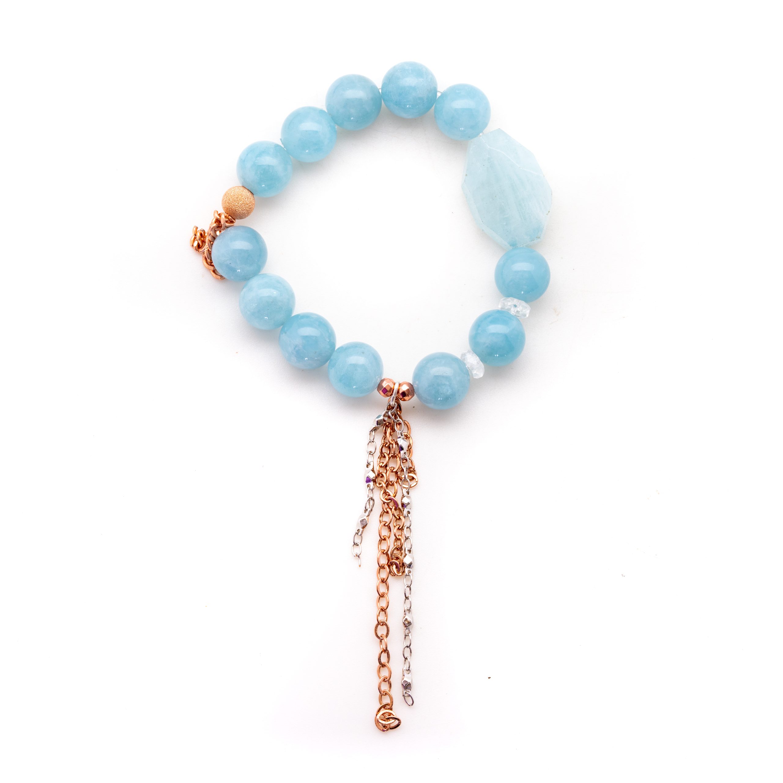 Aquamarine to support the throat chakra – with a 18kt rose gold stardust accent bead and rhodium tasseling. 12mm 7″ stretch bracelet.
