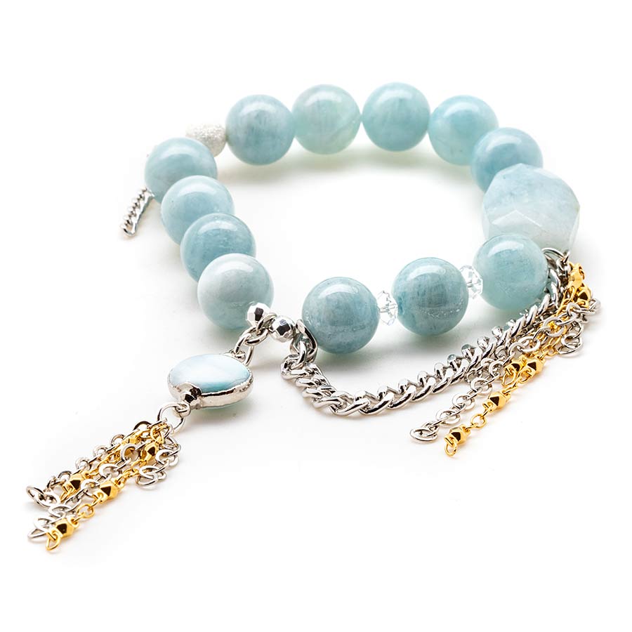 Large smooth aquamarine with sterling silver wrapped tasseled larimar pendant. Sterling silver stardust accent bead and silver rhodium chain and tasseling. Quartz crystal accents. 7 inch stretch bracelet.
