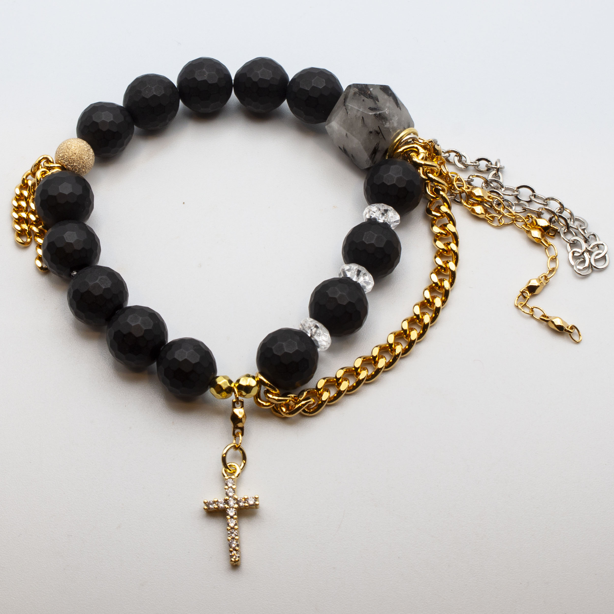 Faceted matte black onyx with a gold crystal cross charm. 18kt gold stardust accent bead and gold rhodium chain and tasseling. 10mm 7″ stretch bracelet.