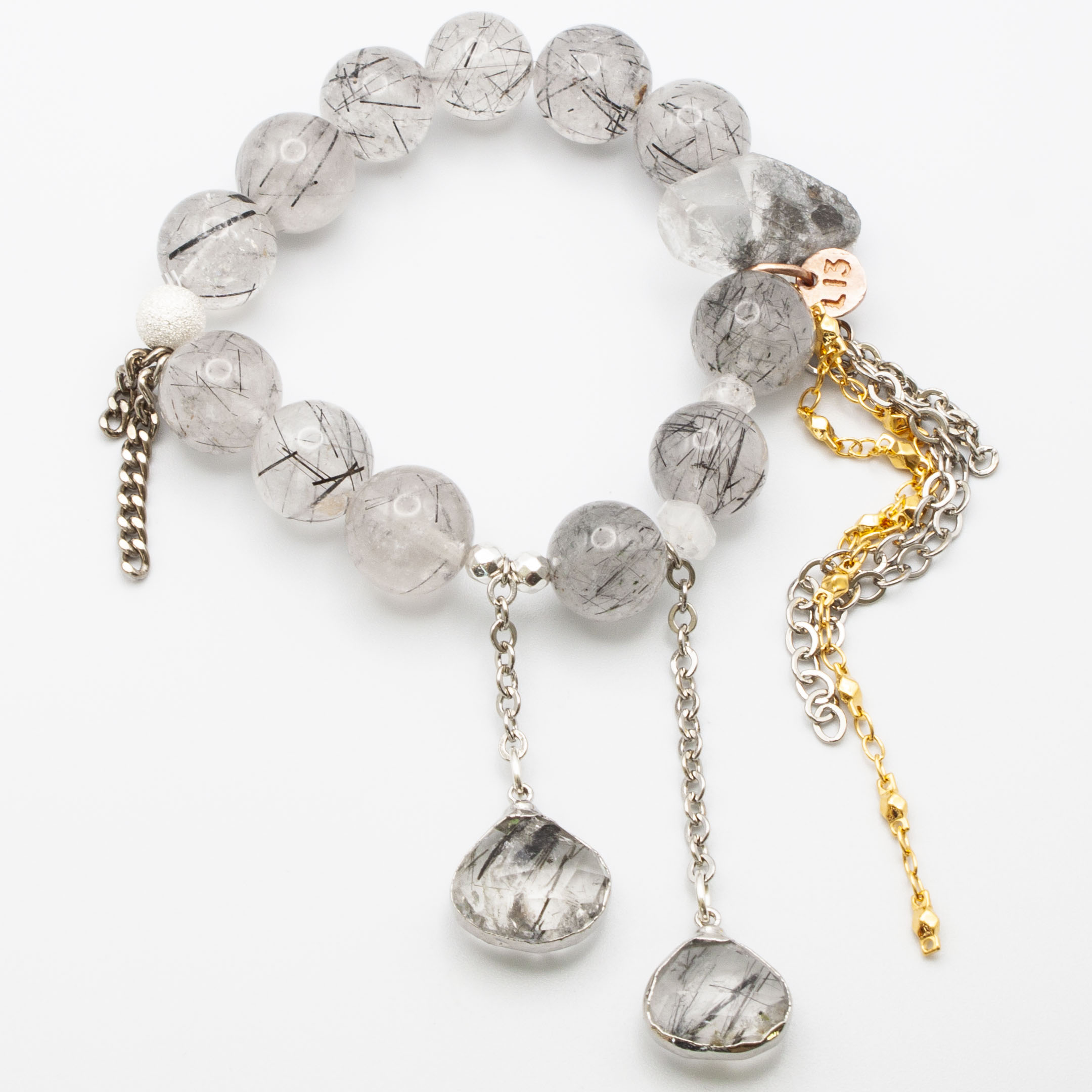 Tourmalinated quartz with sterling silver wrapped rutilated quartz waterfall. Sterling silver stardust accent bead. Silver & gold tasseling. 12mm 7 inch stretch bracelet.