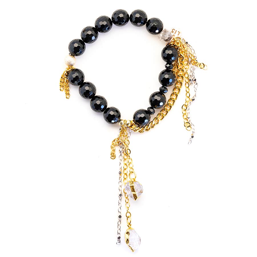 Faceted black tourmaline with 18kt gold plate wrapped Herkimer diamonds. 18kt gold stardust accent bead and gold rhodium chain and tasseling. Herkimer diamond accents. 10mm 7″ stretch bracelet.