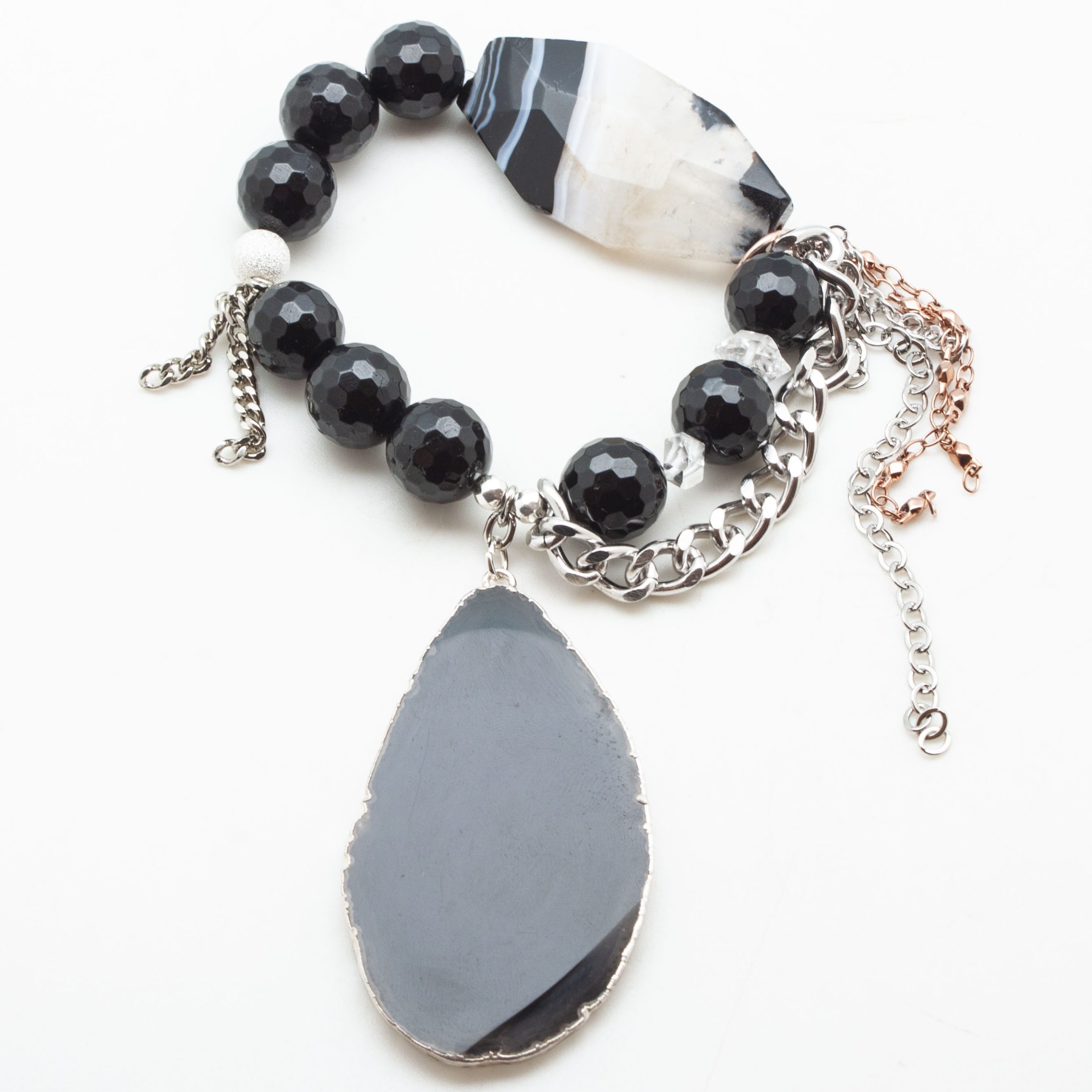 Faceted black tourmaline with a sterling silver wrapped agate slice pendant. Sterling silver stardust accent bead and silver rhodium chain and tasseling. 12mm bead. 7 inch stretch bracelet.