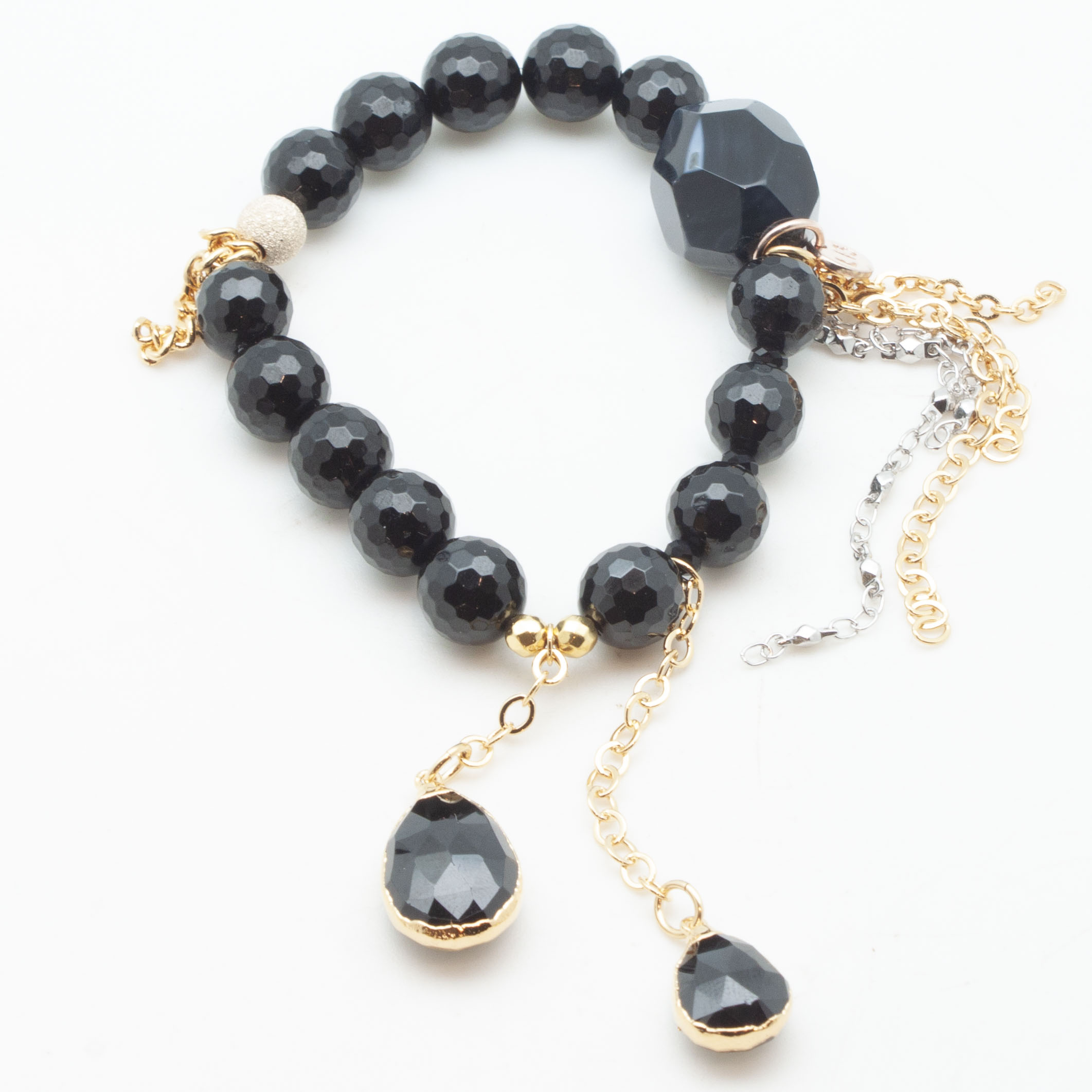 Faceted black tourmaline with 18kt gold plate wrapped black tourmaline pendants. 18kt gold stardust accent bead and gold rhodium chain and tasseling. Agate accents. 10mm. 7 inch stretch bracelet.