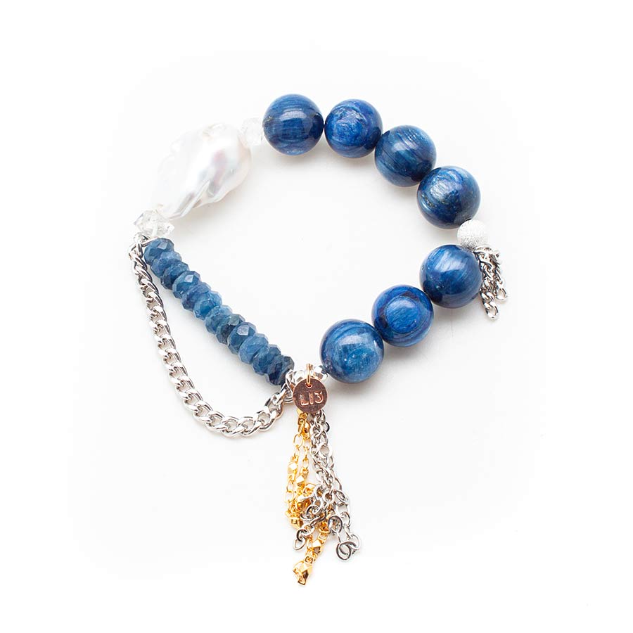 Large & rhondell blue kyanite with a baroque pearl. Herkimer diamond accents, sterling silver stardust bead and rhodium chain and tasseling. 16mm. 7″ stretch bracelet.