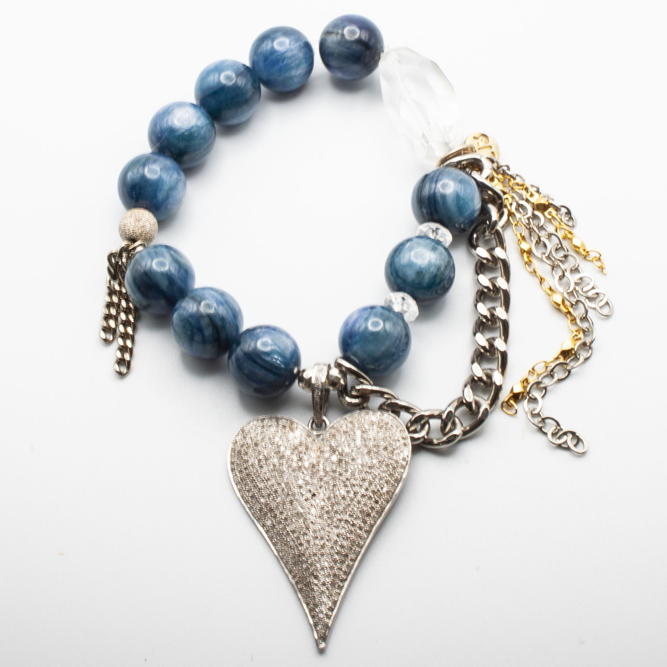 Blue kyanite with a diamond heart pendant. Sterling silver stardust accent bead and silver rhodium chain and tasseling. 7″ stretch bracelet.