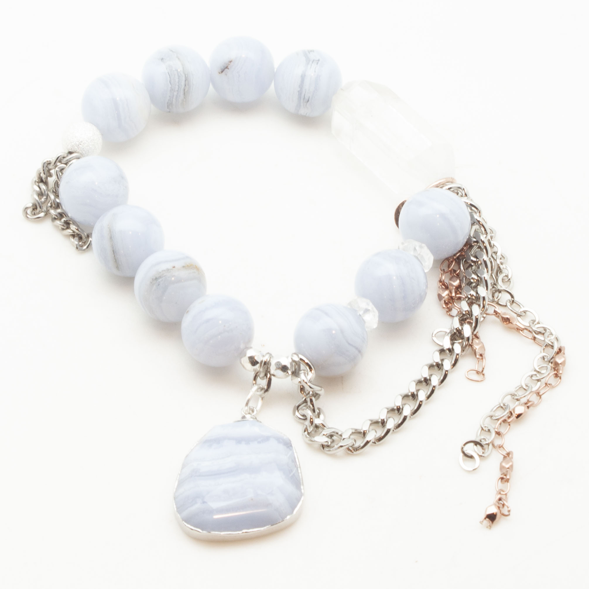 Blue lace agate with a sterling silver wrapped blue lace agate pendant. Sterling silver stardust accent bead and silver rhodium chain and tasseling. 12mm. 7 inch stretch bracelet.