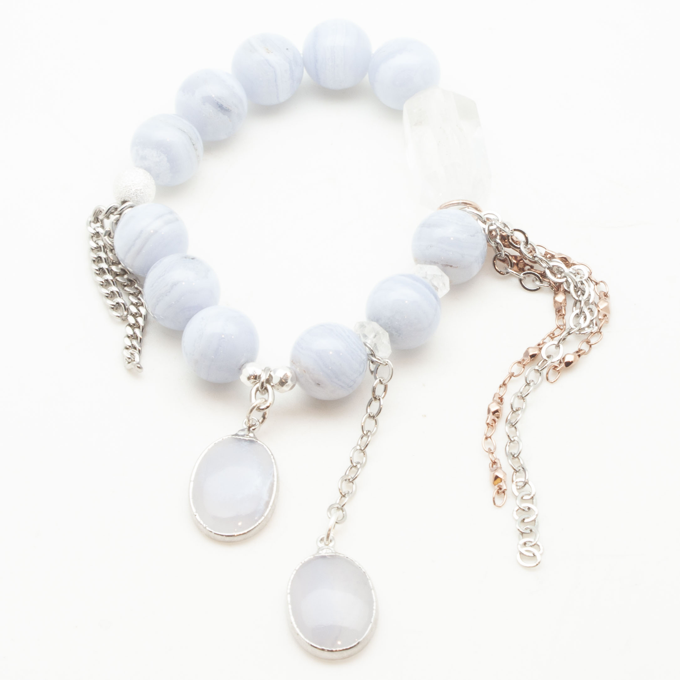 Blue lace agate with sterling silver wrapped blue lace agate pendants. Sterling silver stardust accent bead and silver rhodium chain and tasseling. 12mm. 7 inch stretch bracelet.
