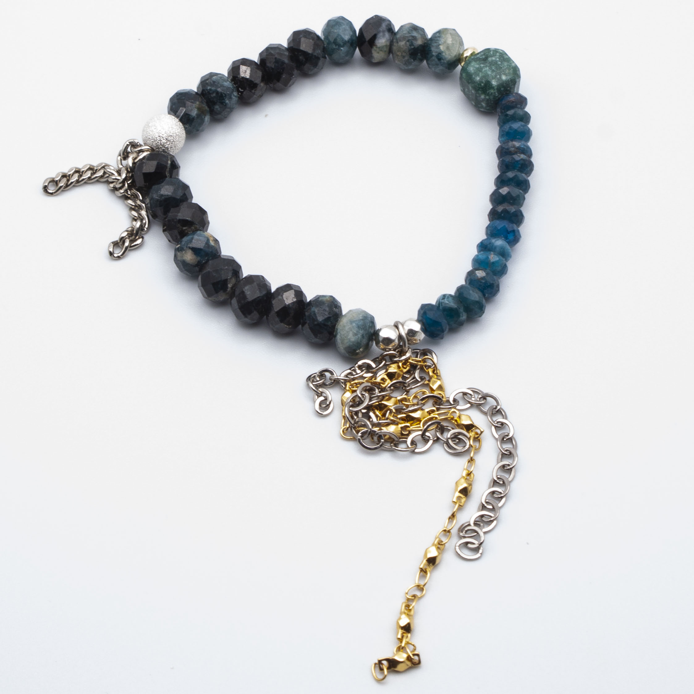 Petite faceted blue tourmaline with sterling silver stardust accent bead and silver rhodium chain and tasseling. 7 inch stretch bracelet.