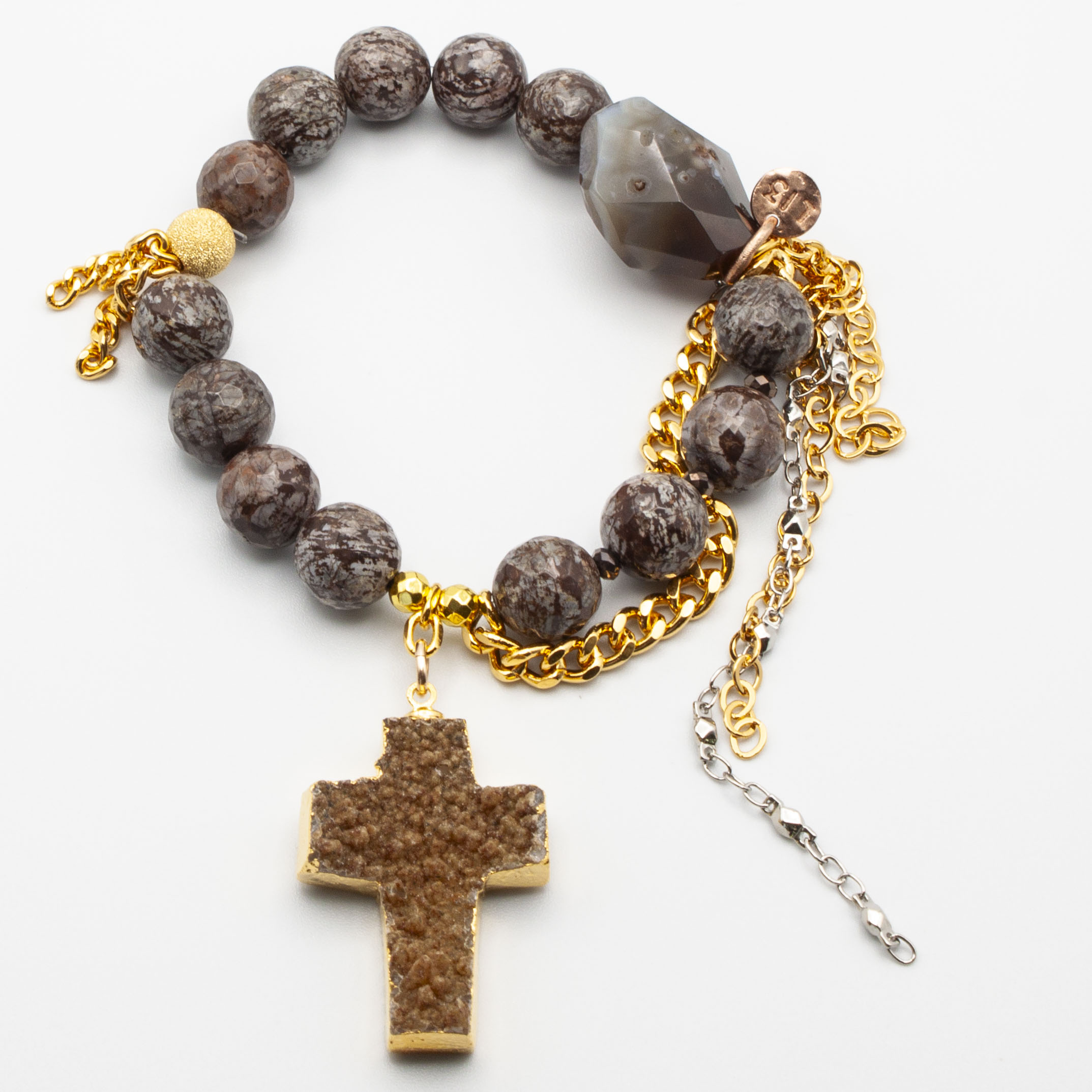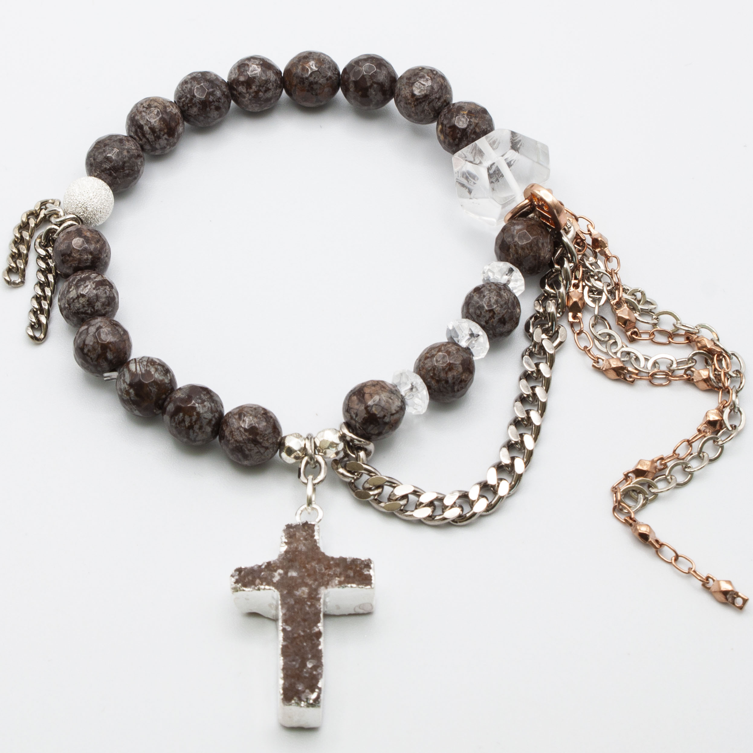 Brown Jasper with a Sterling silver wrapped druzy cross. Sterling silver stardust accent bead and silver rhodium chain and tasseling. 9mm 7 inch stretch bracelet.