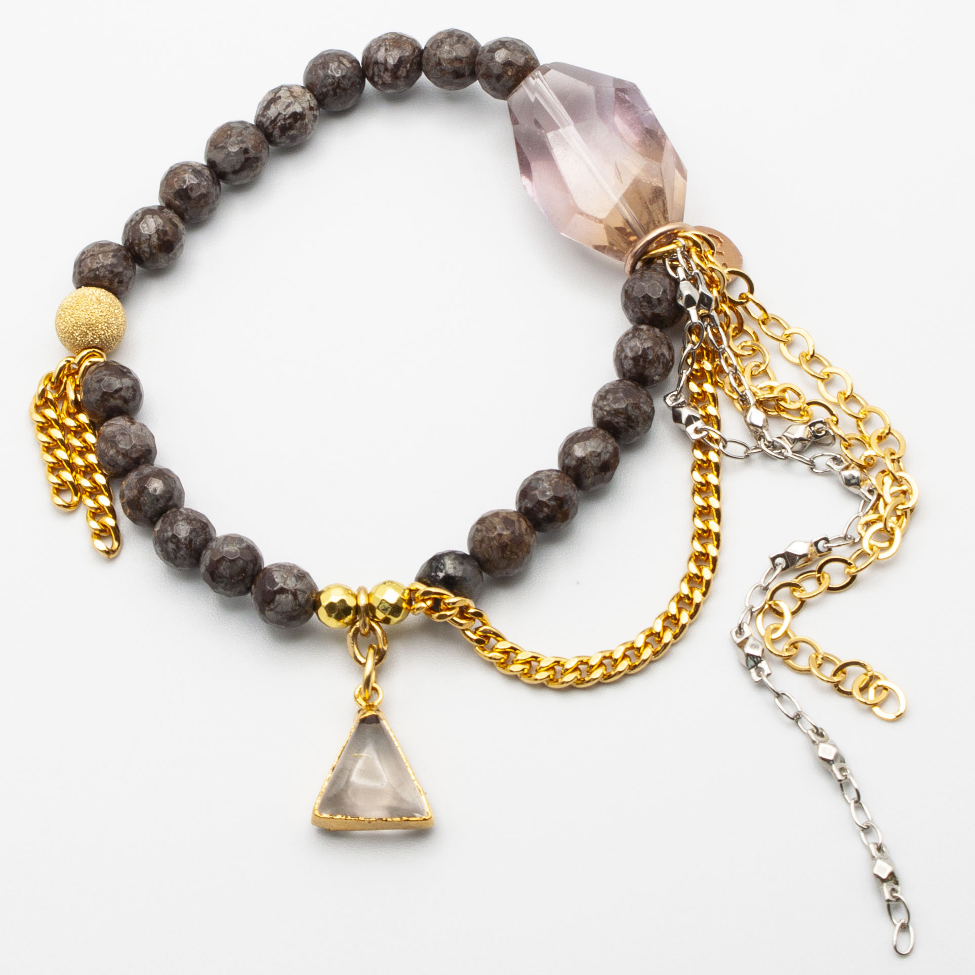 Brown jasper with a 18kt gold plate wrapped golden rutilated quartz crystal pendant. 18kt gold stardust accent bead and gold rhodium chain and tasseling. Fluorite accent. 6mm 7 inch stretch bracelet.