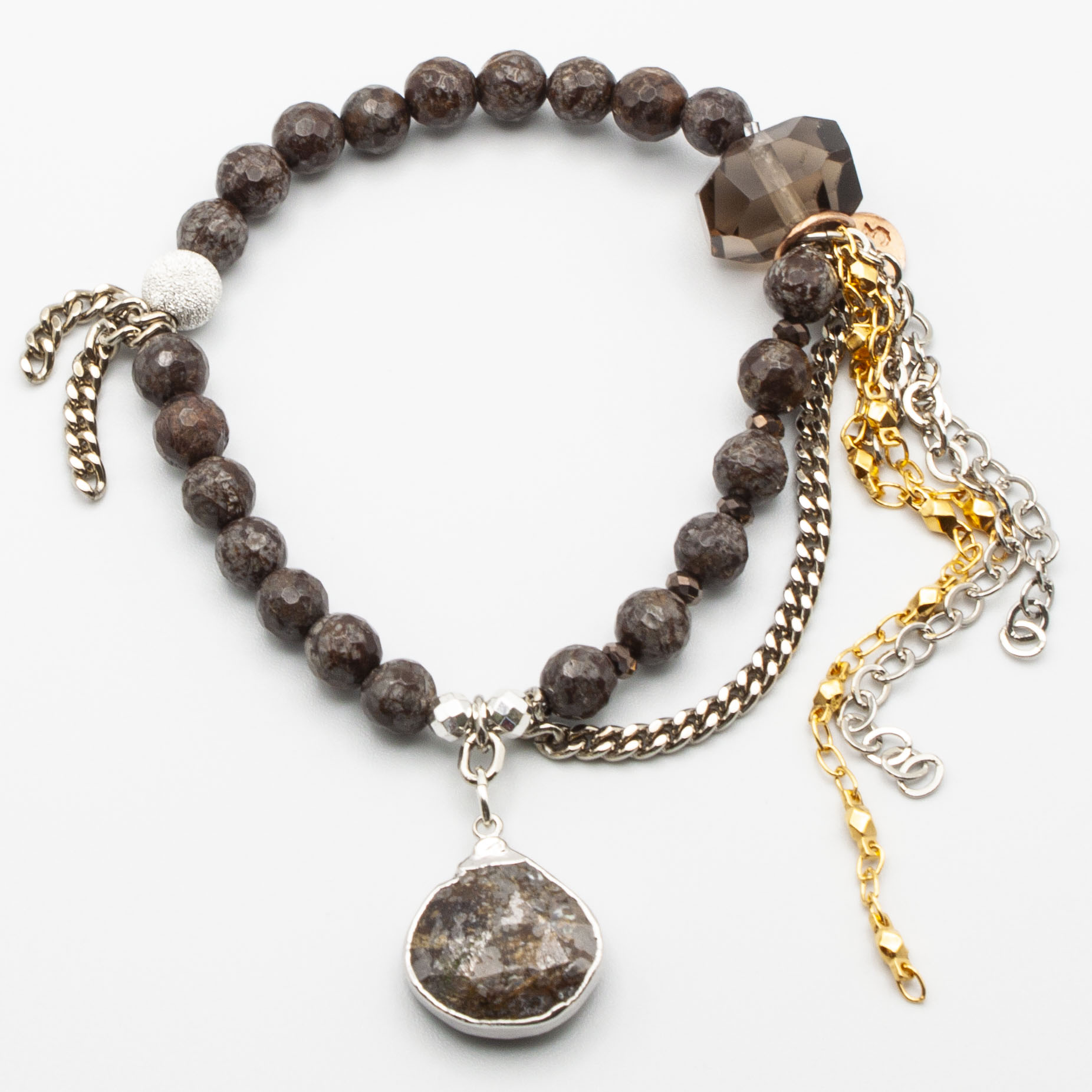 Brown jasper with a sterling silver wrapped jasper pendant. Sterling silver stardust accent bead and silver rhodium chain and tasseling. Smoky accents. 6mm 7 inch stretch bracelet.