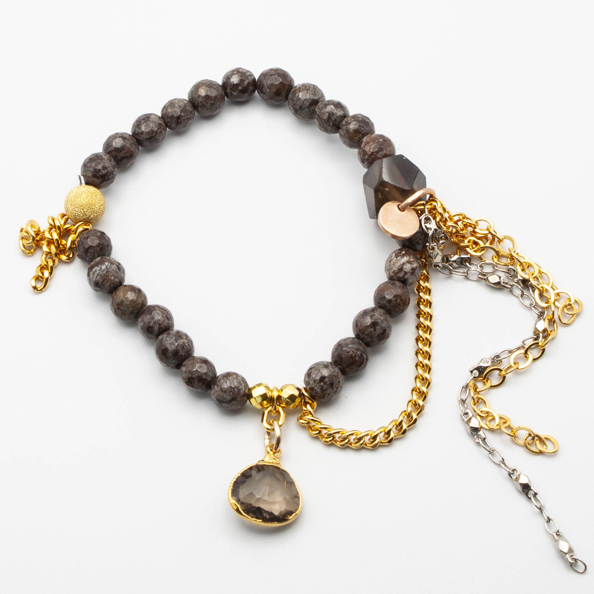 Brown jasper with a 18kt gold plate wrapped smoky quartz crystal pendant. 18kt gold stardust accent bead and gold rhodium chain and tasseling. Smoky accents. 6mm 7 inch stretch bracelet.