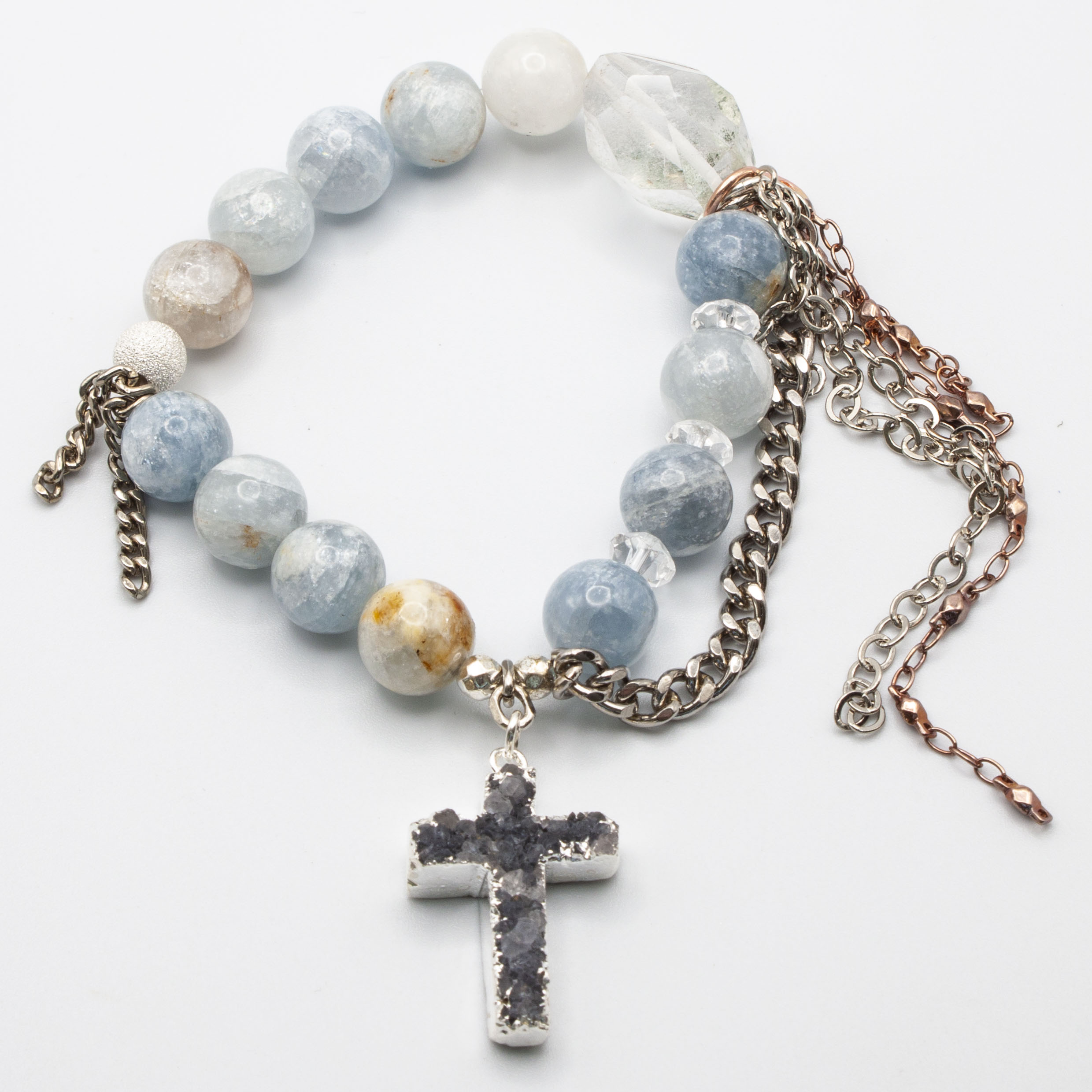 Celestite with a sterling silver wrapped amethyst druzy cross. Sterling silver stardust accent bead and silver rhodium chain and tasseling. 10mm. 7″ stretch bracelet.