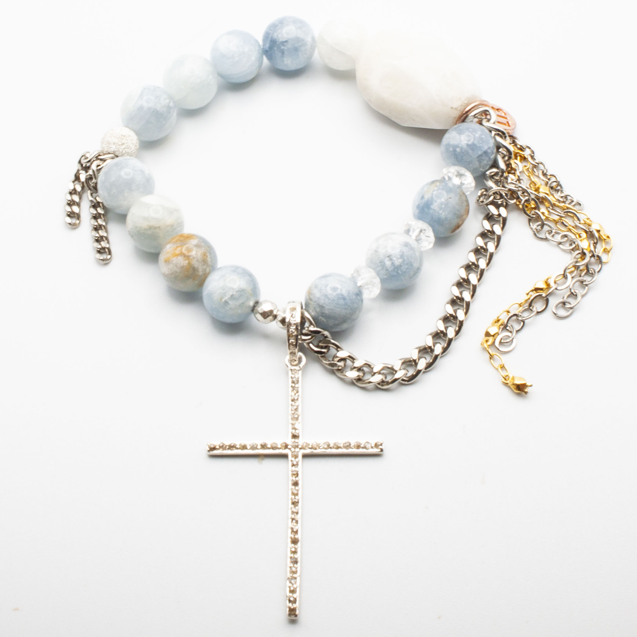 Celestite with a Diamond Cross. Sterling silver stardust accent bead and silver rhodium chain and tasseling. 10mm 7″ stretch bracelet.