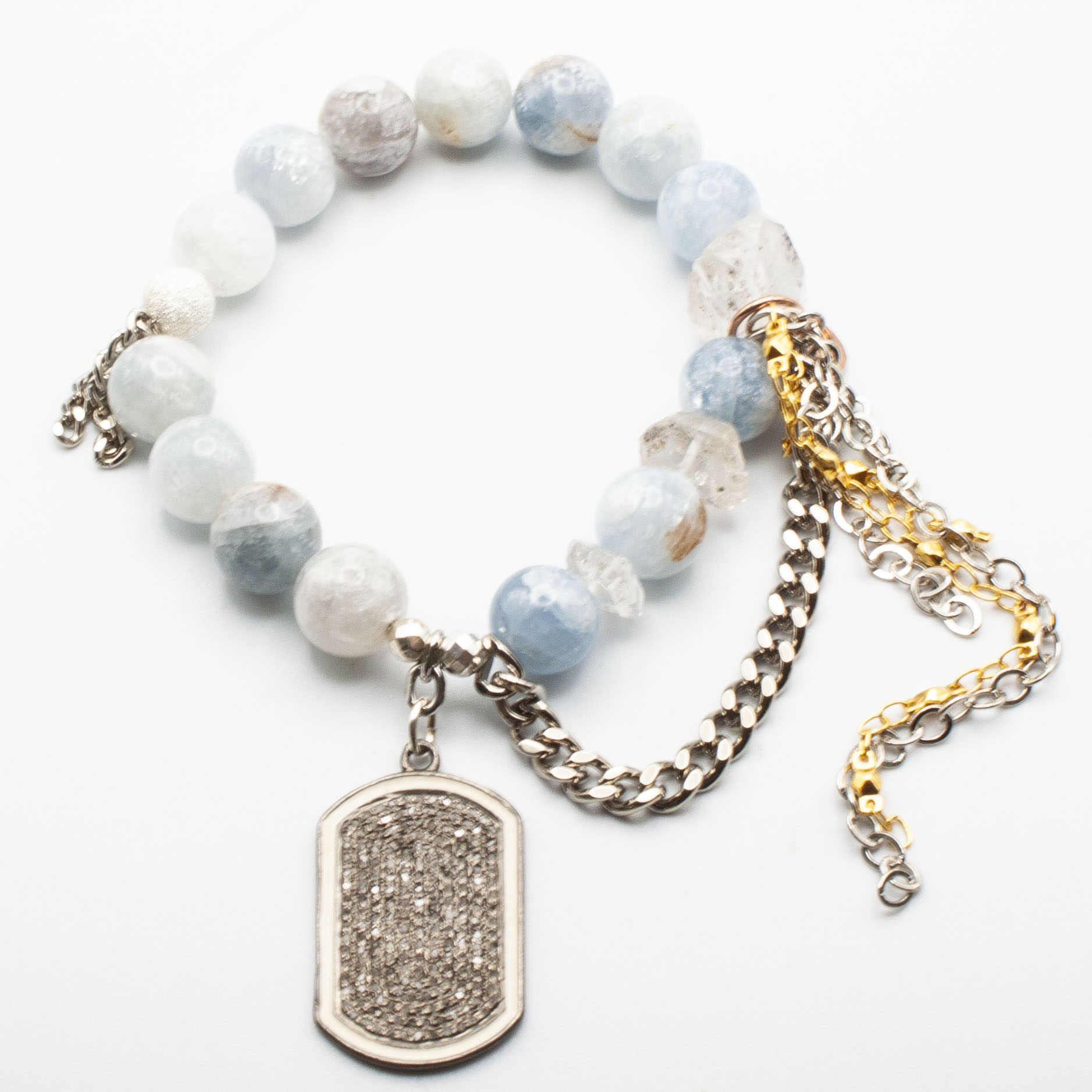 Celestite with a Diamond Dog Tag. Sterling silver stardust accent bead and silver rhodium chain and tasseling. 10mm 7″ stretch bracelet.