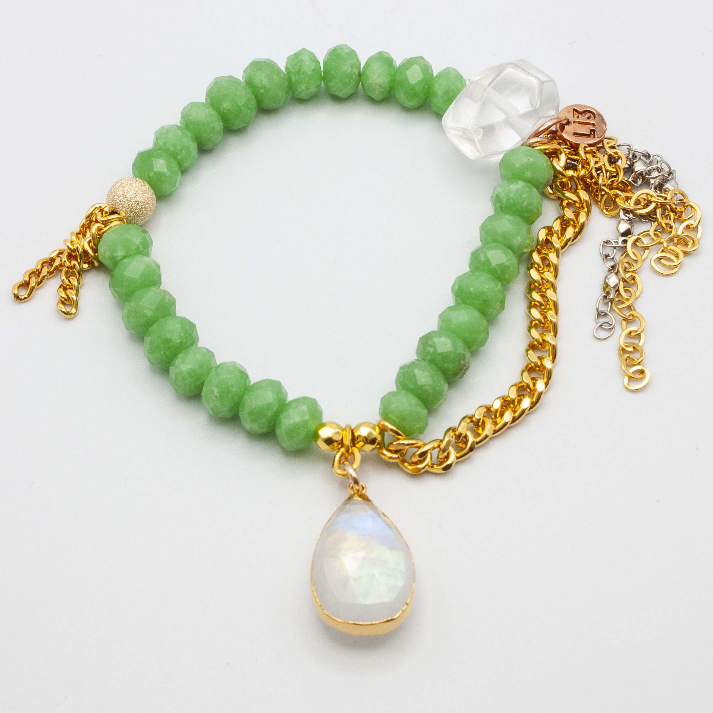 Chrysocolla with a 18kt gold plate wrapped moonstone pendant. 18kt gold stardust accent bead and gold rhodium chain and tasseling. 7″ stretch bracelet.