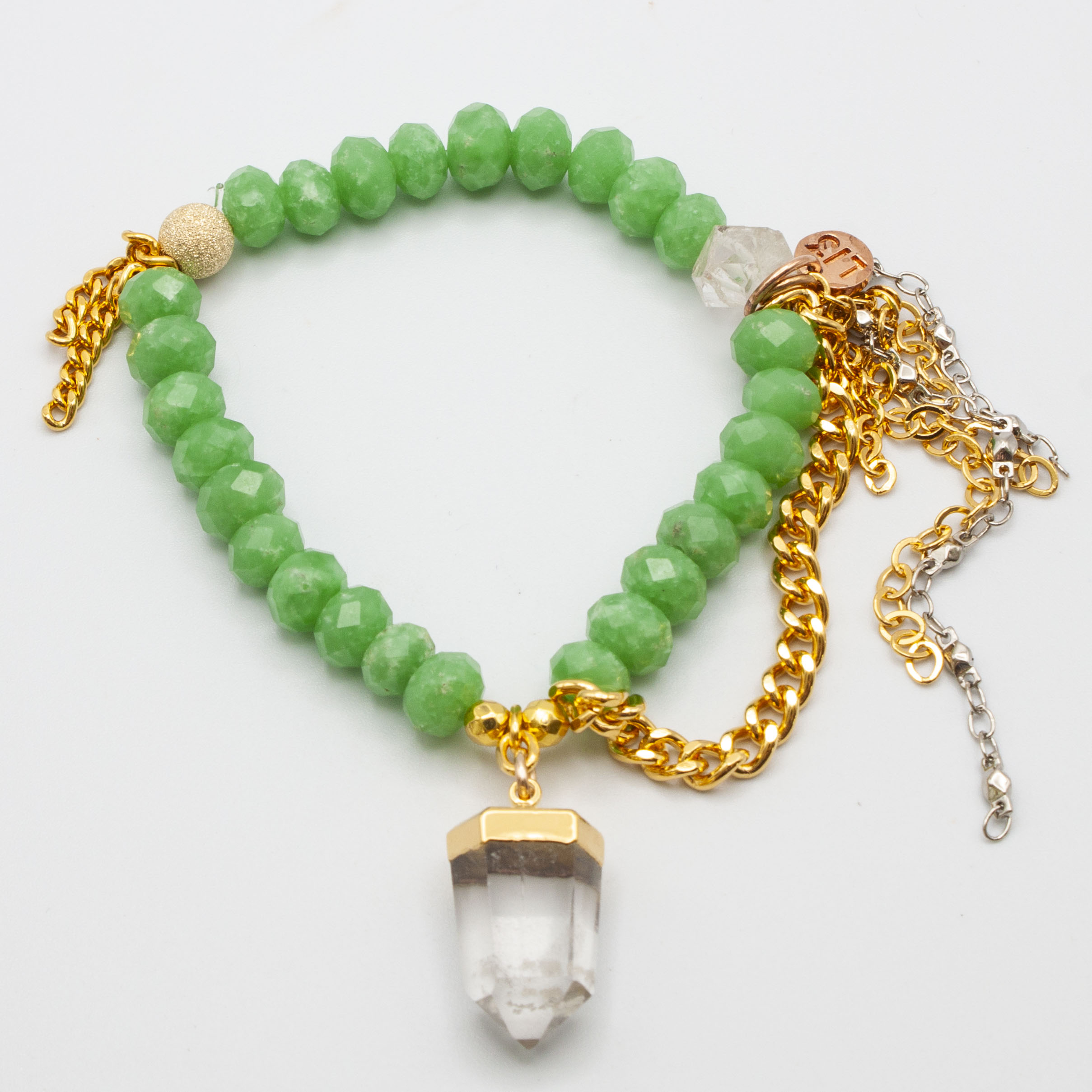Chrysocolla with a 18kt gold plate wrapped quartz crystal pendant. 18kt gold stardust accent bead and gold rhodium chain and tasseling. 7″ stretch bracelet.