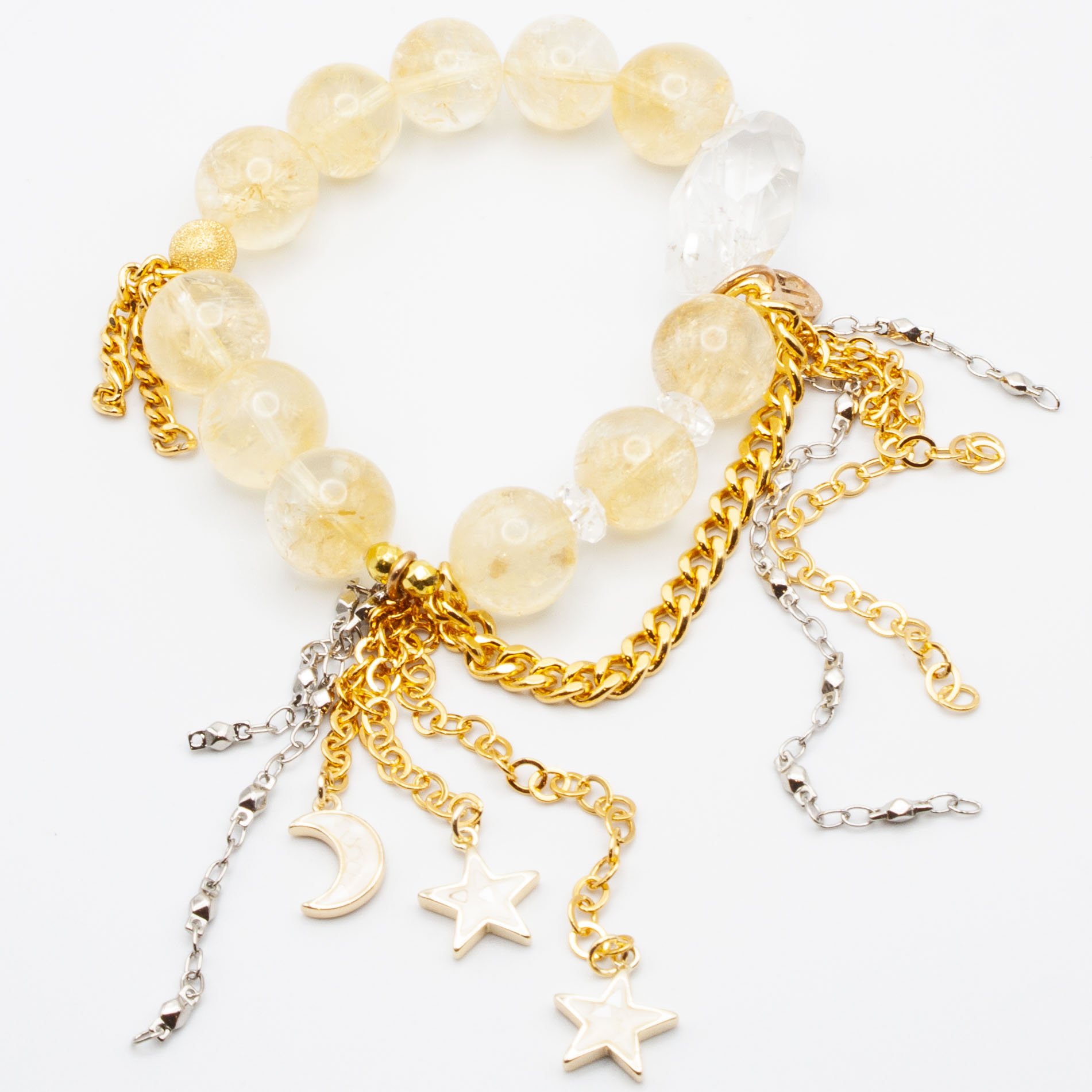 Citrine with moon and star pendants. 18kt gold stardust accent bead and gold rhodium chain and tasseling. Quartz crystal accents. 12mm bead. 7 inch stretch bracelet.