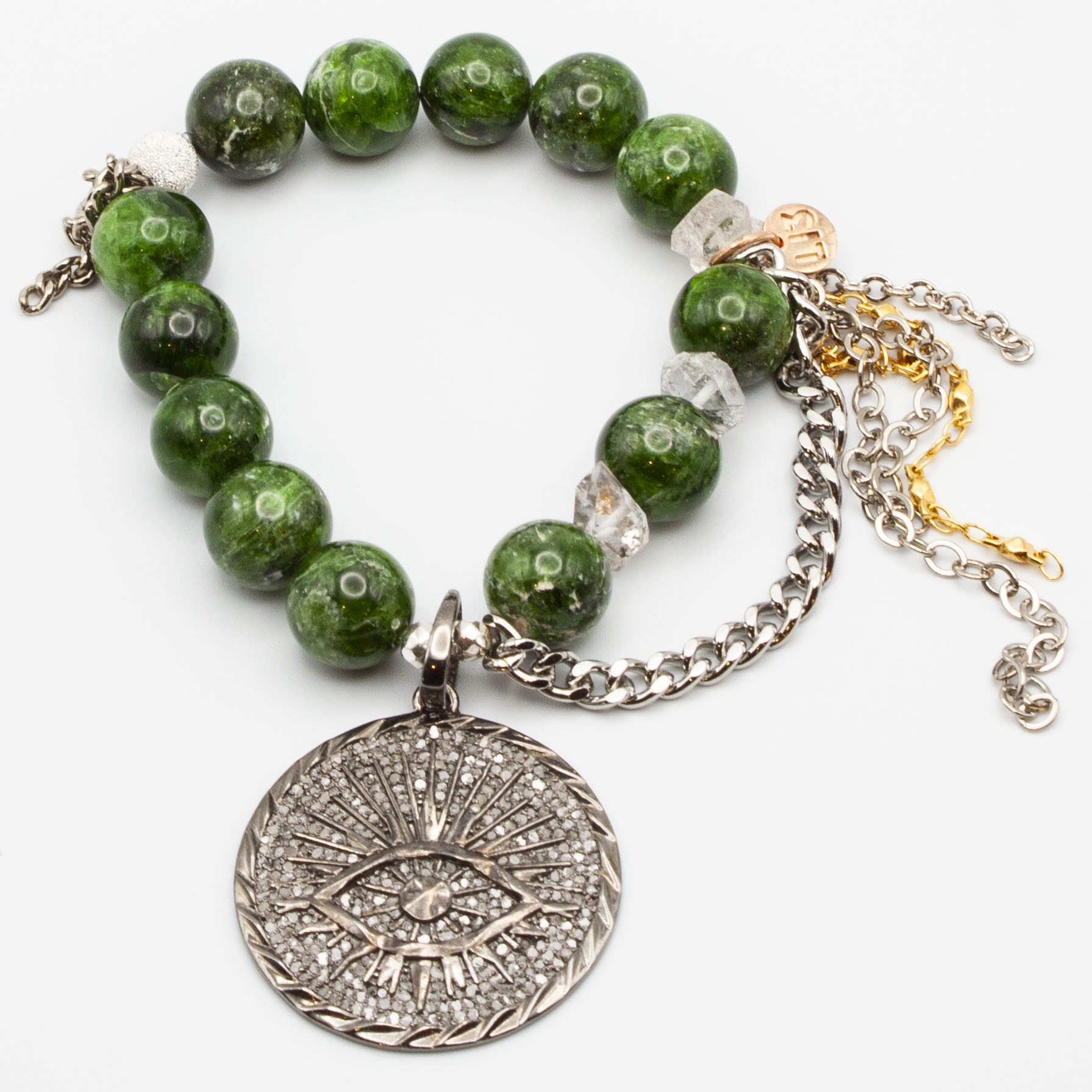 Diopside with a diamond evil eye pendant. Sterling Silver stardust accent bead and silver rhodium chain and tasseling. Quartz crystal accents. 12mm bead. 7 inch stretch bracelet.