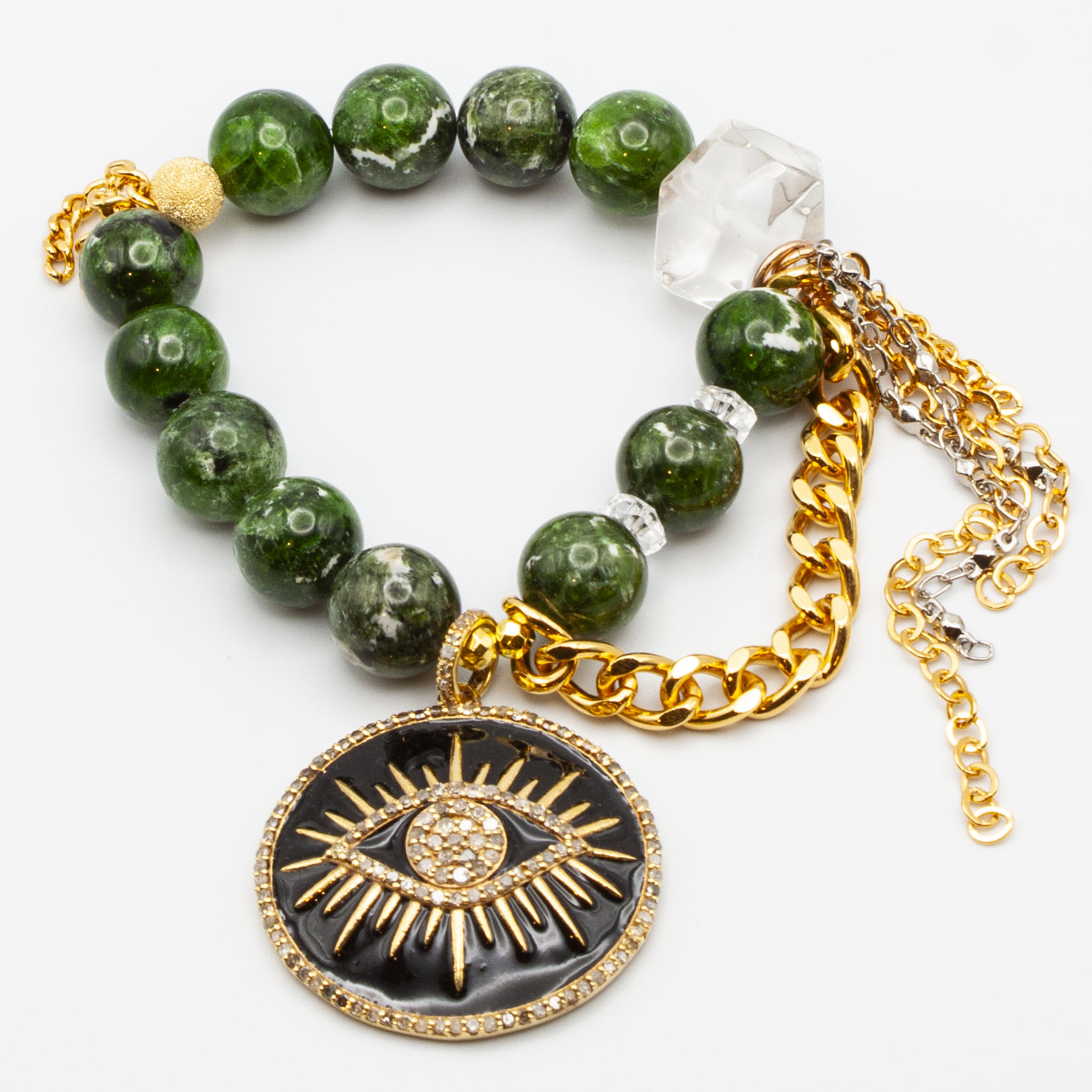 Diopside with a diamond evil eye pendant. Sterling Silver stardust accent bead and silver rhodium chain and tasseling. Quartz crystal accents. 12mm bead. 7 inch stretch bracelet.