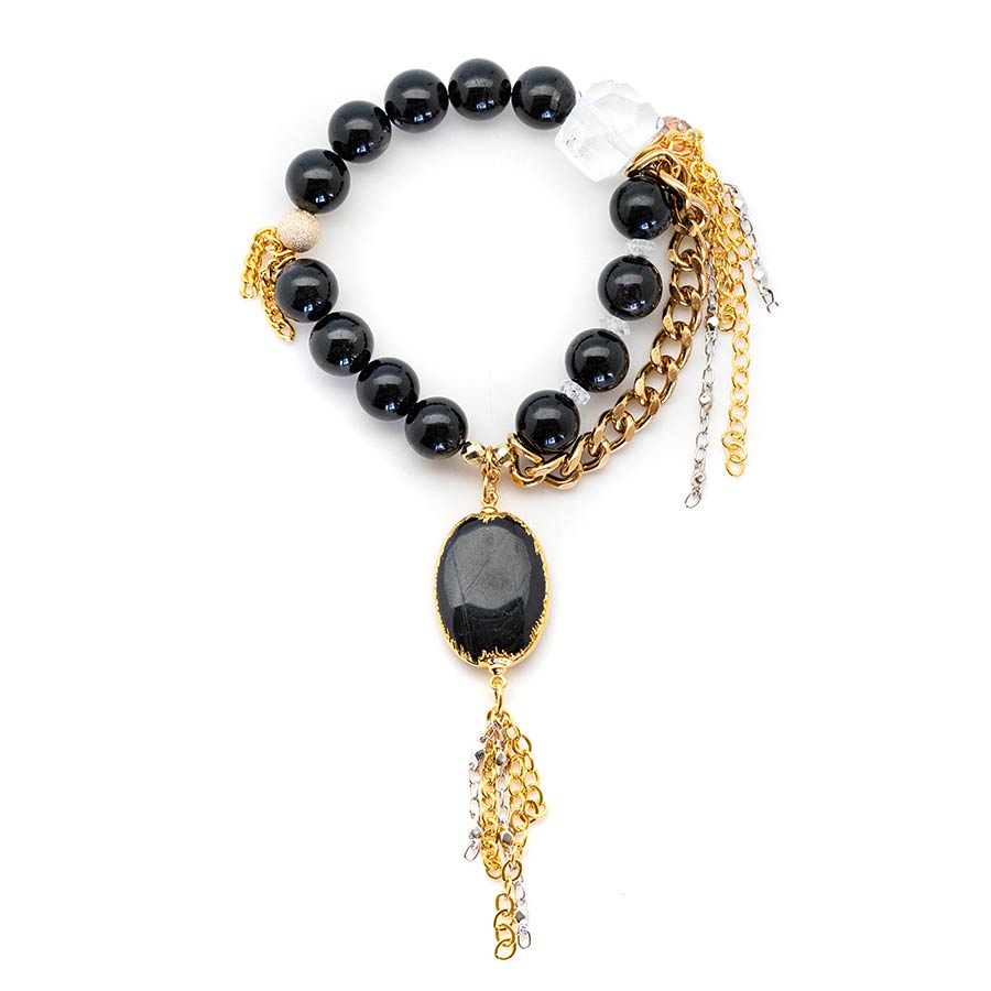 Hypersthene gives us the permission to play as the spiritual beings we are. She expands our field and then from this expanded space, shields and protects all that rests within. She is ideal for the soul who needs room to stretch her gifts and explore what she is capable o f experiencing and creating. With this beauty upon your arm, you are safe to be all you were divinely created to be! Hypersthene with 18kt gold plate wrapped hypersthene pendant, 18kt gold stardust accent bead and gold rhodium chain. 7 inch stretch bracelet. Please indicate silver or gold in notes.