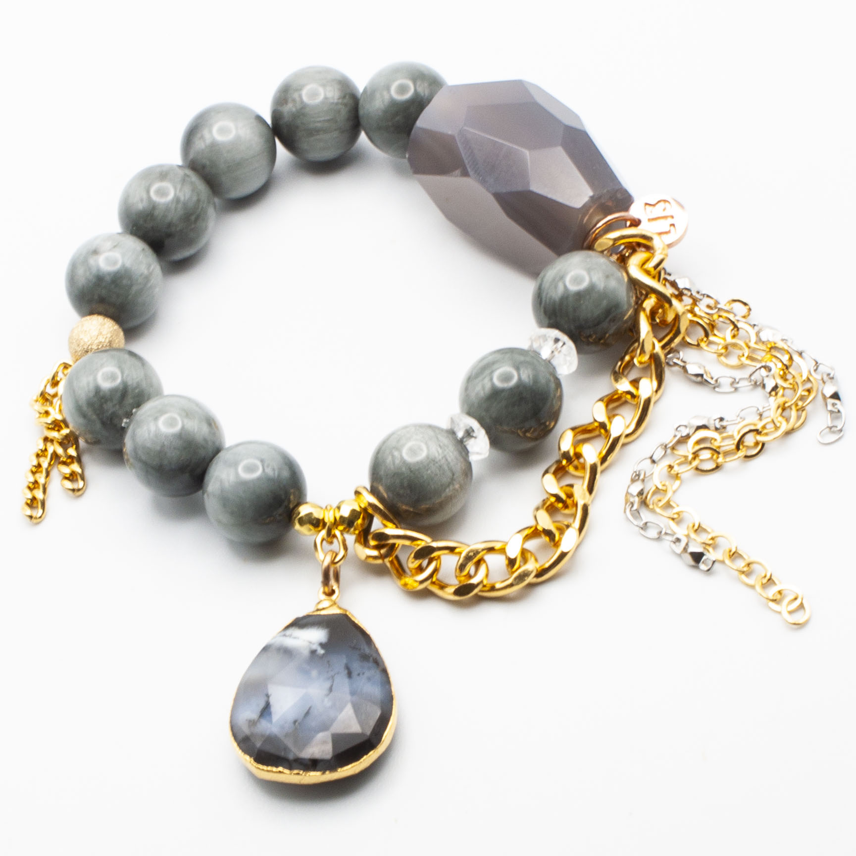 Eagle eye with a 18kt gold plate wrapped opal pendant. 18kt gold stardust accent bead and gold rhodium chain and tasseling. 12mm 7″ stretch bracelet.