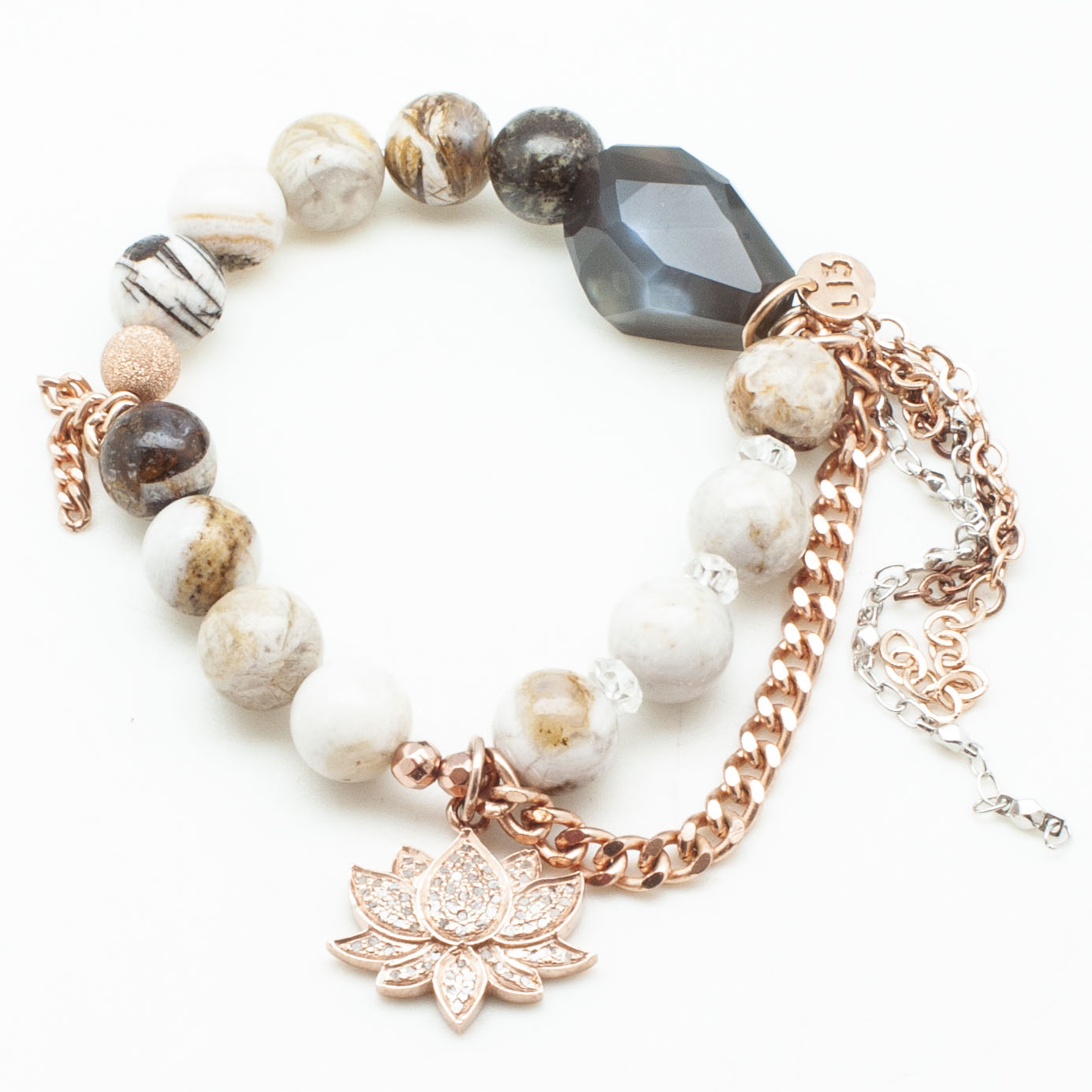 Fossilized jasper with a rose gold vermiel diamond lotus. 18kt rose gold stardust accent bead and rose gold rhodium chain and tasseling. 7″ stretch bracelet.