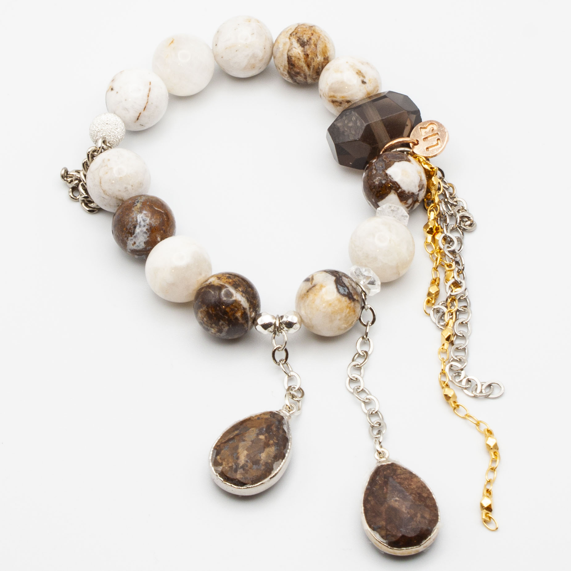 Fossilized jasper with sterling silver wrapped jasper pendants. Sterling silver stardust accent bead and silver rhodium chain and tasseling. 12mm bead. 7 inch stretch bracelet.