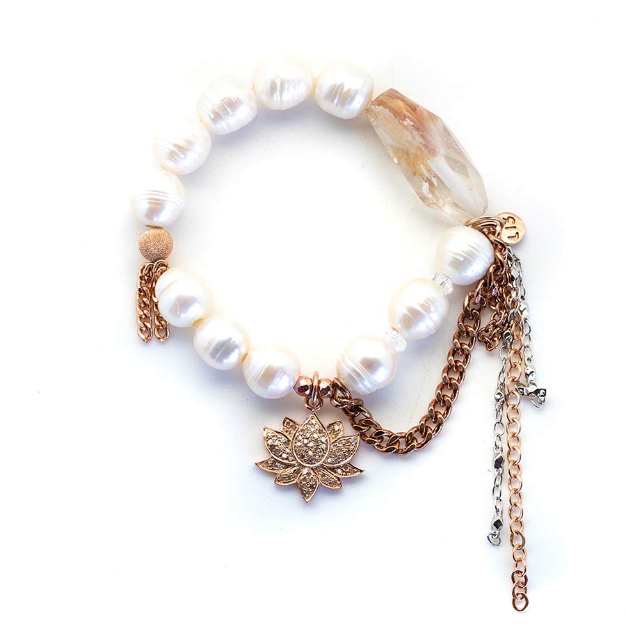Goddess Pearls with a diamond lotus flower pendant. 18kt rose gold stardust accent bead and rose gold rhodium chain and tasseling. 7″ stretch bracelet.