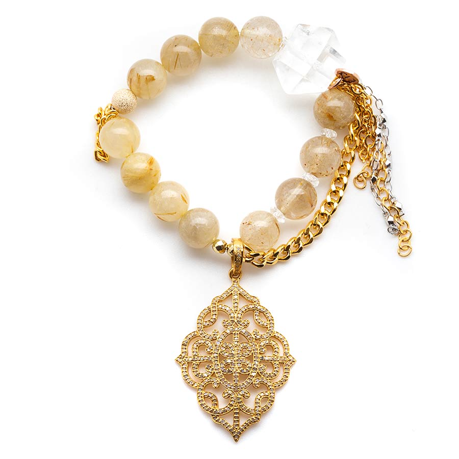 Golden rutilated quartz with a diamond pendant. 18kt gold stardust accent bead and gold rhodium chain and tasseling. Quartz crystal accents. 12mm bead. 7″ stretch bracelet.