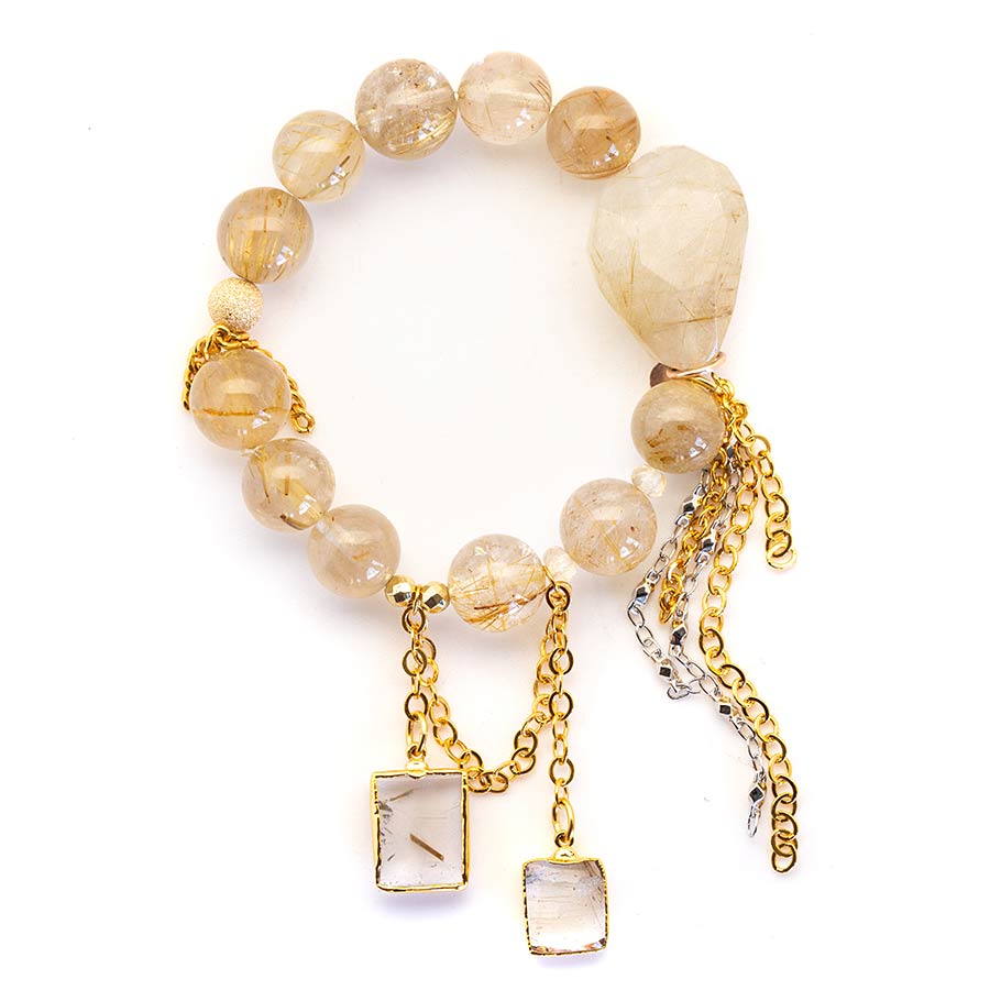 Golden rutilated with a 18kt golden rutilated pendants. 18kt gold stardust accent bead and gold rhodium chain. 12mm 7″ stretch bracelet.
