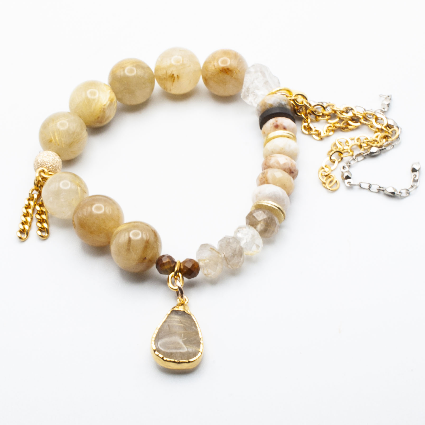 Golden rutilated quartz and yellow opals with a 18kt gold plate wrapped golden rutilated quartz crystal pendant. 18kt gold stardust accent bead and rhodium tasseling. 12mm 7″ stretch bracelet.