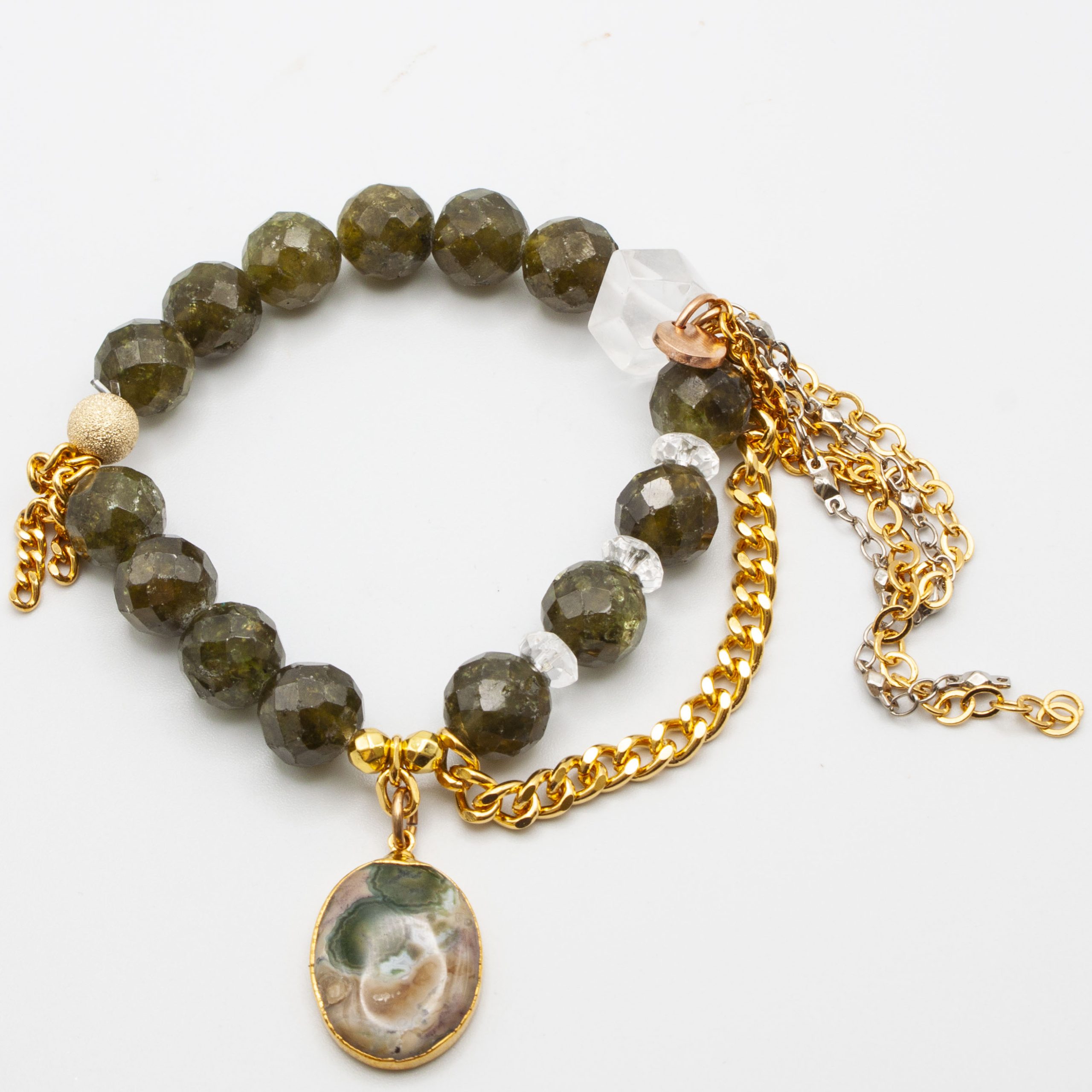 Faceted green garnets with a 18kt gold plate wrapped agate pendant. 18kt gold stardust accent bead and gold rhodium chain and tasseling. 10mm bead. 7″ stretch bracelet.