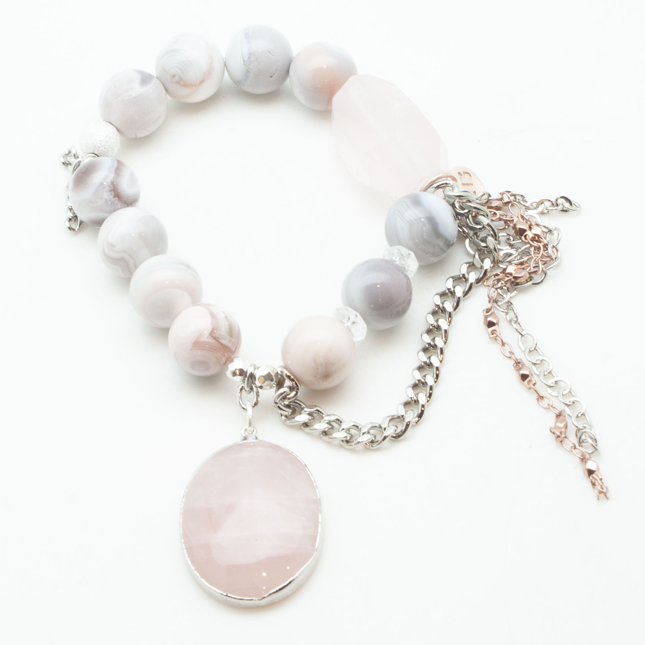 Your heart hurts and your body carries the burden. Allow these gentle, yet effective love crystals to sweep over and through your body like a soft blanket – healing grief, replacing pain with softness and love. Lavender Botswana Agate and Rose Quartz. 7 inch stretch bracelet.