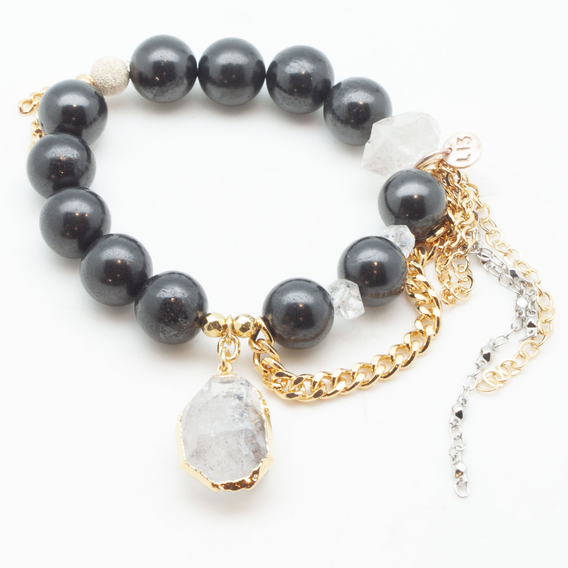 There is no more powerful physical healing crystal than shungite. Paired brilliantly with herkimer diamonds and you have an amplified combo that cannot be denied within the body – cleansing, clearing and bringing harmony to any imbalance! Expect miracles when you wear this piece!! 7 inch stretch bracelet.