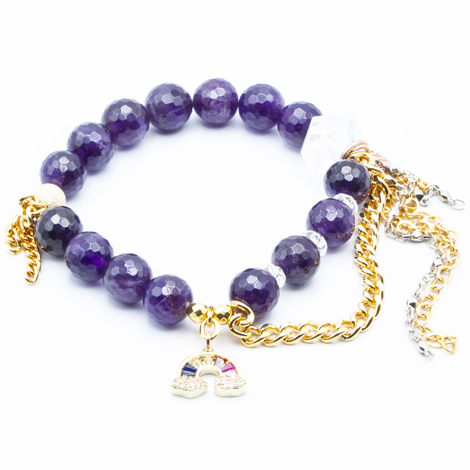 As you step into a brand new year, you move with intention to be the best version of yourself – divinely guided and receptive, centered & neutral and clear in your mind, body & spirit. Allow the gifts of amethyst to enhance your intuition, shield against negativity, calm anxiety and keep you clear. She will support you in a healthy sleep pattern, boost your immunity and even support you sobriety and drinking less! This January 13th, we offer you a faceted amethyst with a crystal rainbow pendant. May she bring a smile to your face and a shine to your heart! 10mm faceted. 7 inch stretch bracelet.