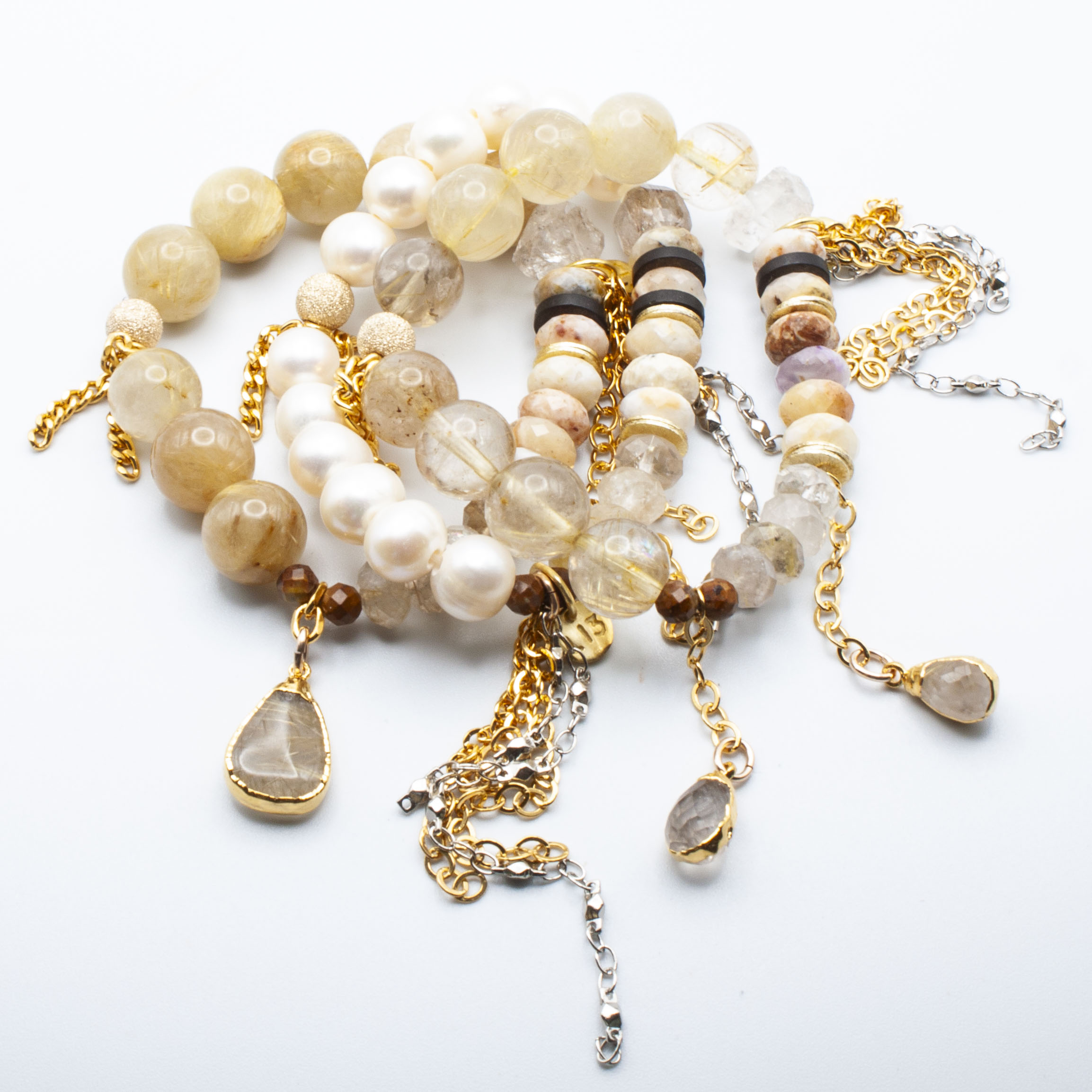 The purity of your heart and mind cast forward the highest level of manifestation – your resounding command is heard and honored. Miracles are returned back to you, answering your wishes and filling your heart with hope and gratitude. Golden rutilated quartz and pearls designed with a playful wristwrap of yellow opals. Each adorned with 18kt gold plate wrapped crystals, 18kt gold stardust accent beads and gold rhodium tasseling. 7 inch stretch bracelets.