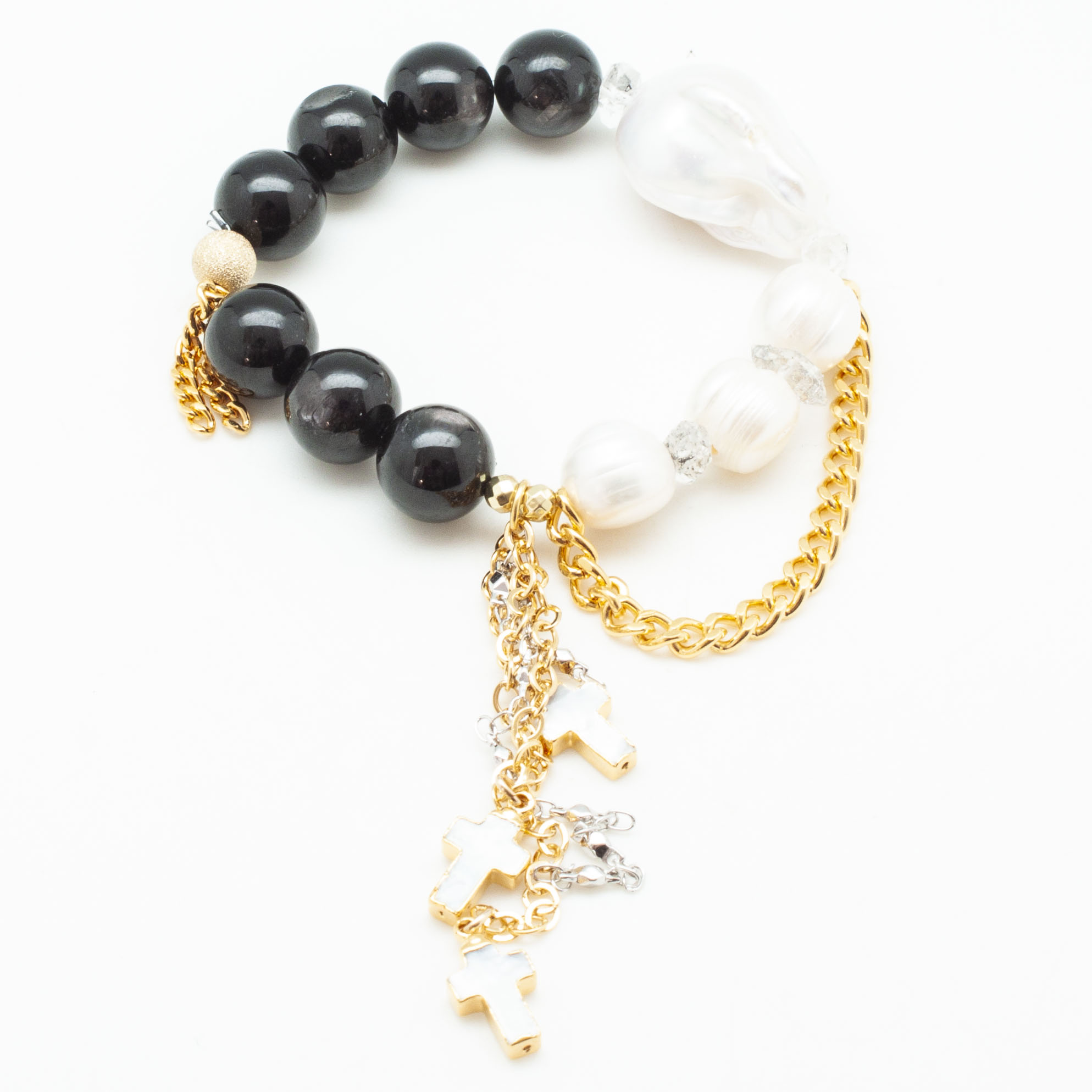 Hypersthene & Pearls adorned with a baroque pearl, 18kt gold plate wrapped abalone crosses and an 18kt gold stardust accent bead. 7″ stretch bracelet.