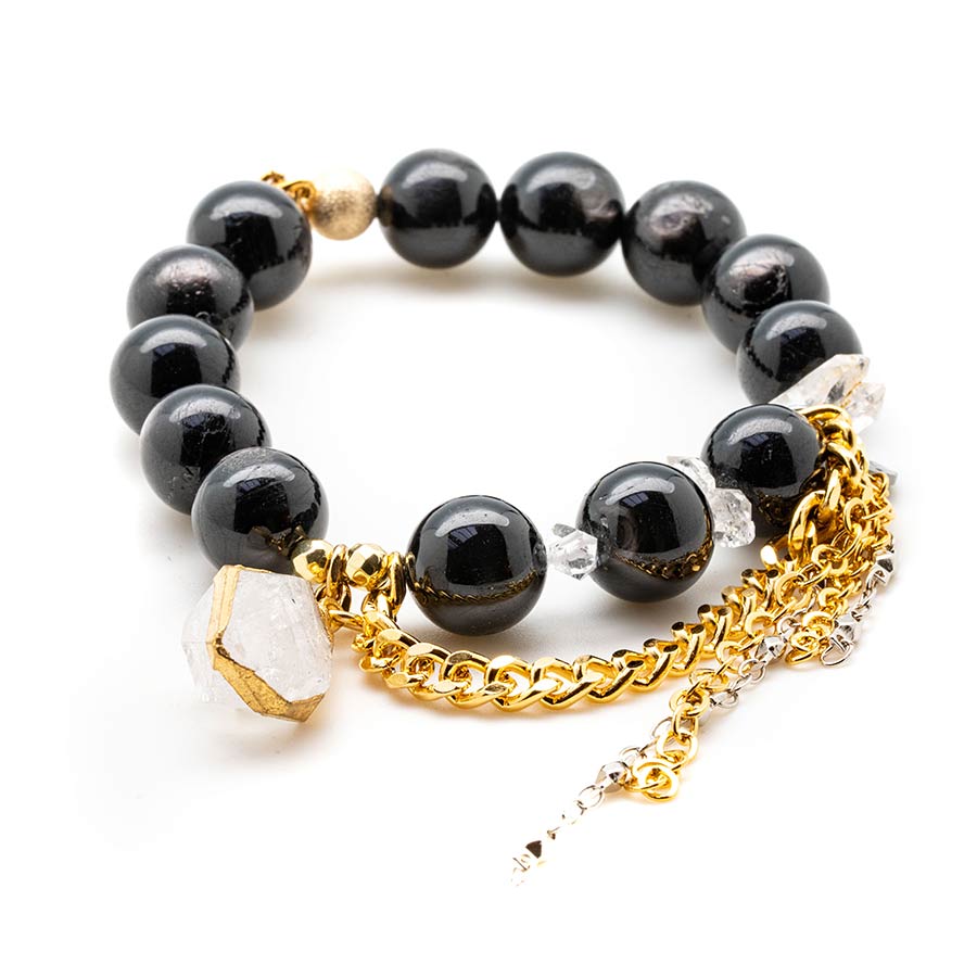Large hypersthene with a 18kt gold plate wrapped herkimer diamond pendant. 18kt gold stardust accent bead and gold rhodium chain and tasseling. Herkimer diamond accents. 7 inch stretch bracelet.