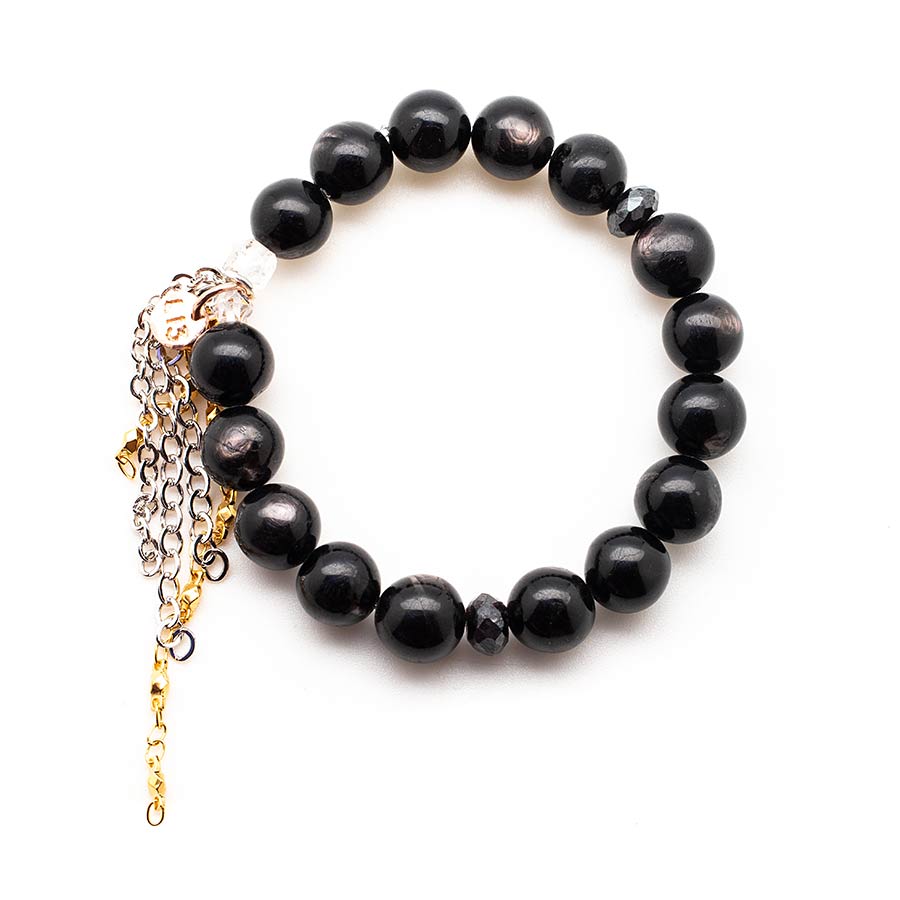 Hypersthene with sugilite and herkimer diamond accents. LOVEthirteen signature tassel. 7 inch stretch bracelet.