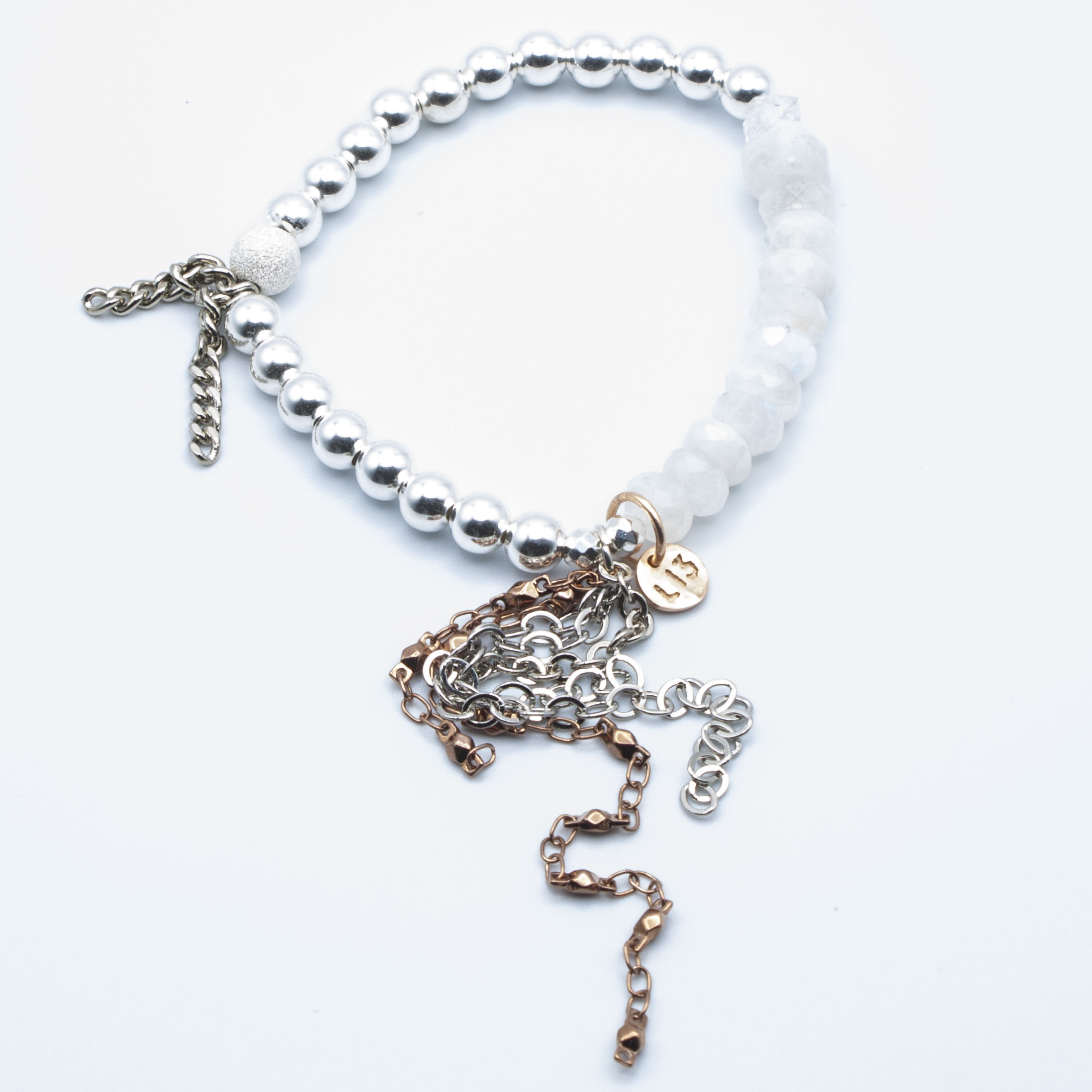 Created and Blessed to support you in being connected to the Divine Feminine – full of strength & prosperity, yet full of grace and kindness! Sterling silver with Moonstone. 7 inch stretch bracelet.